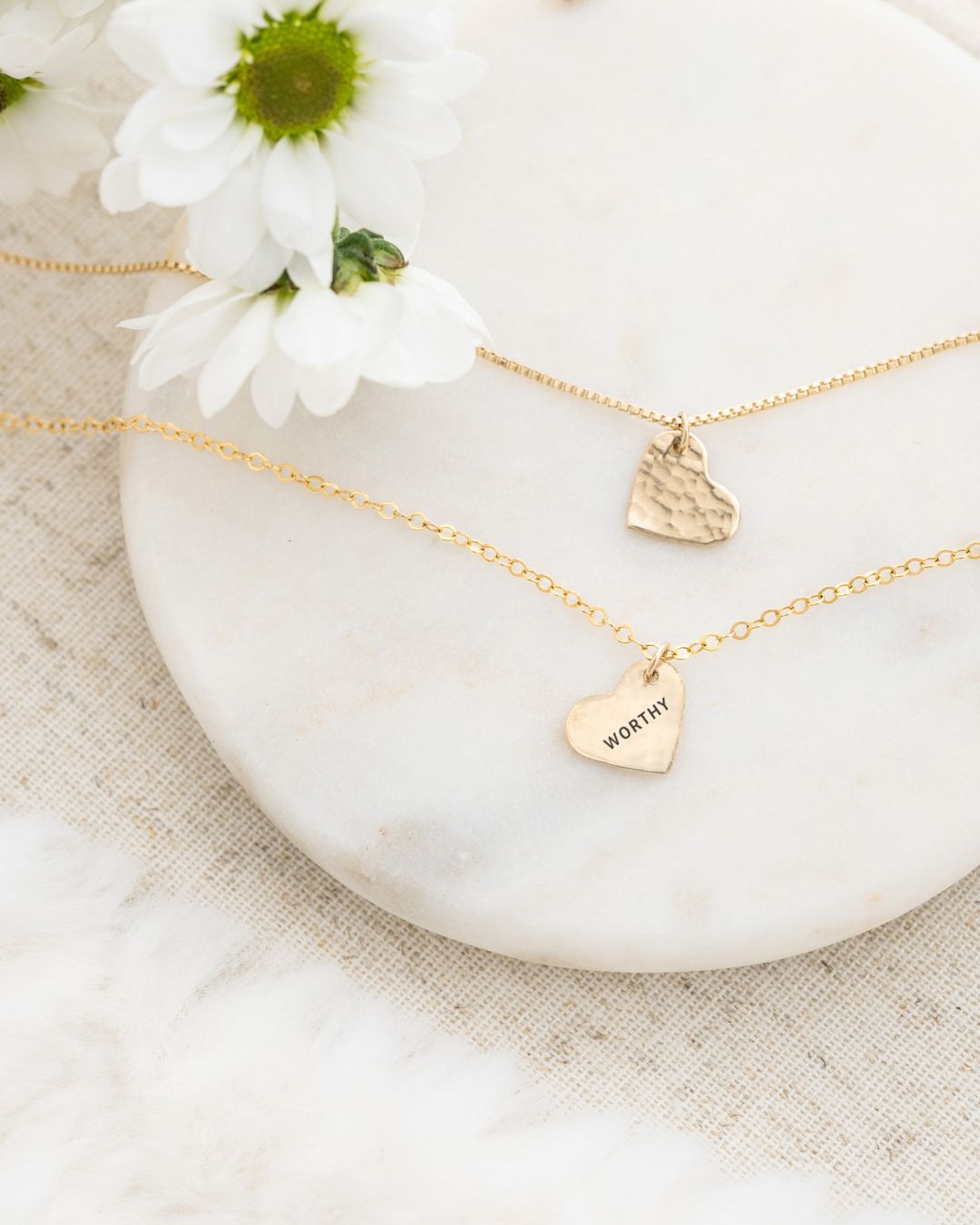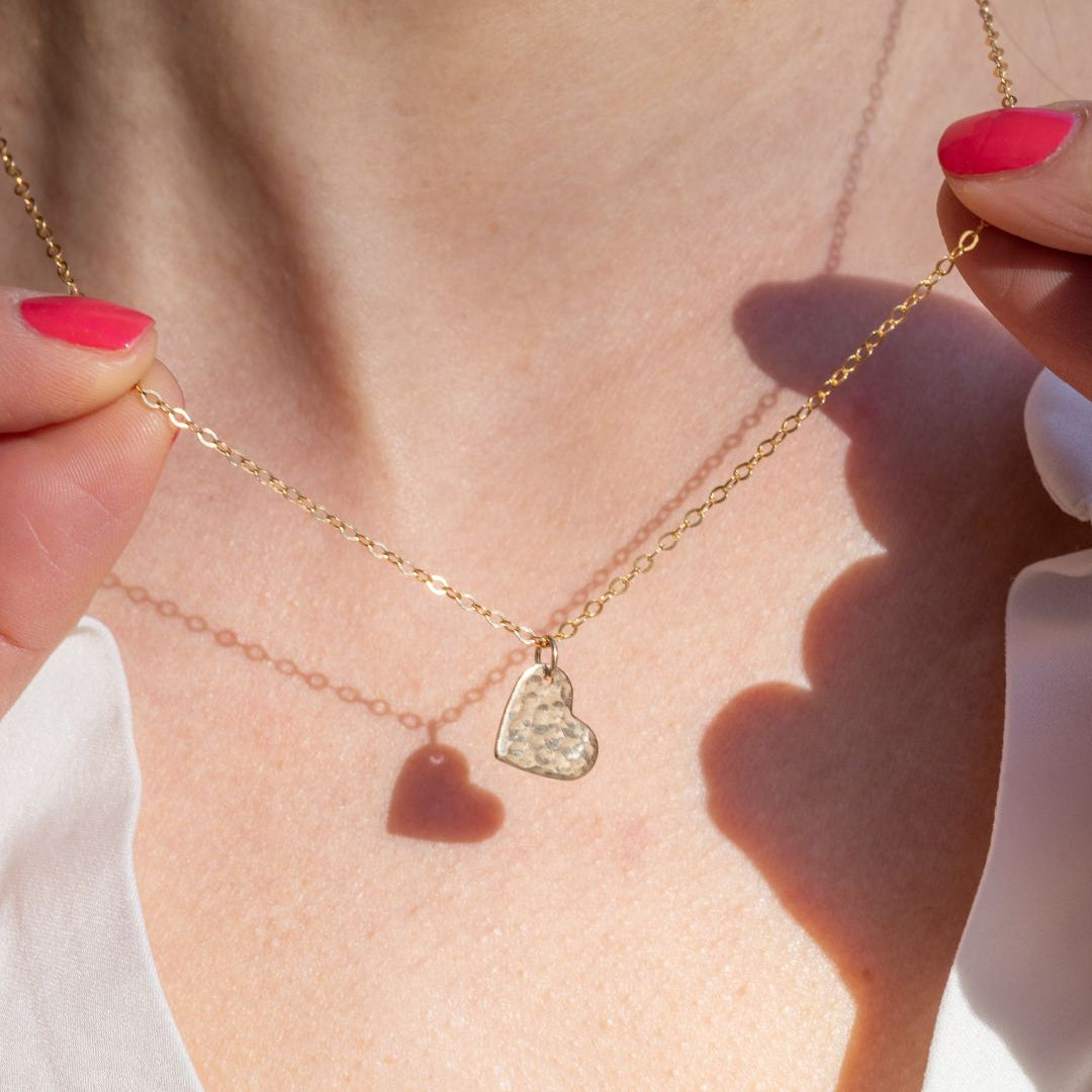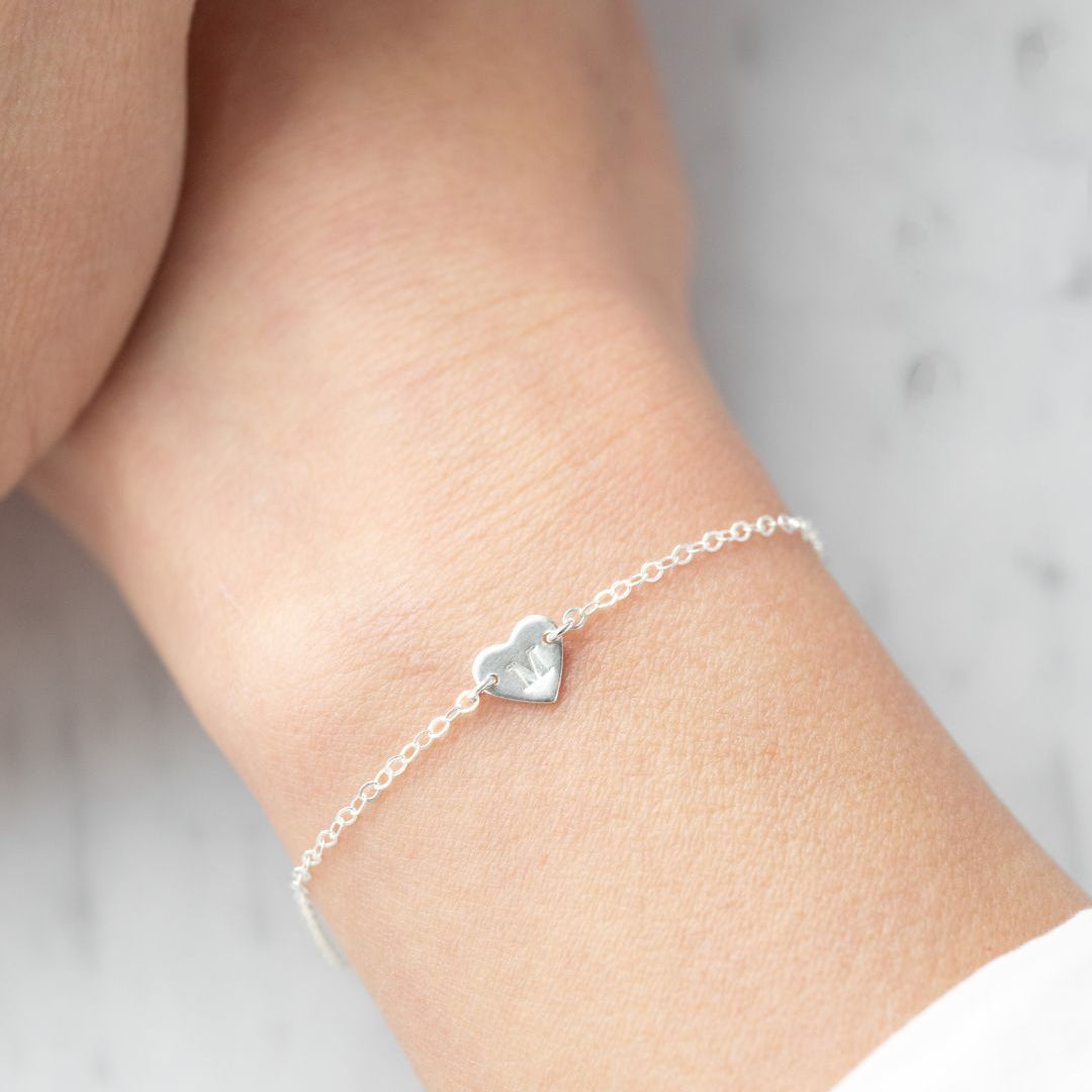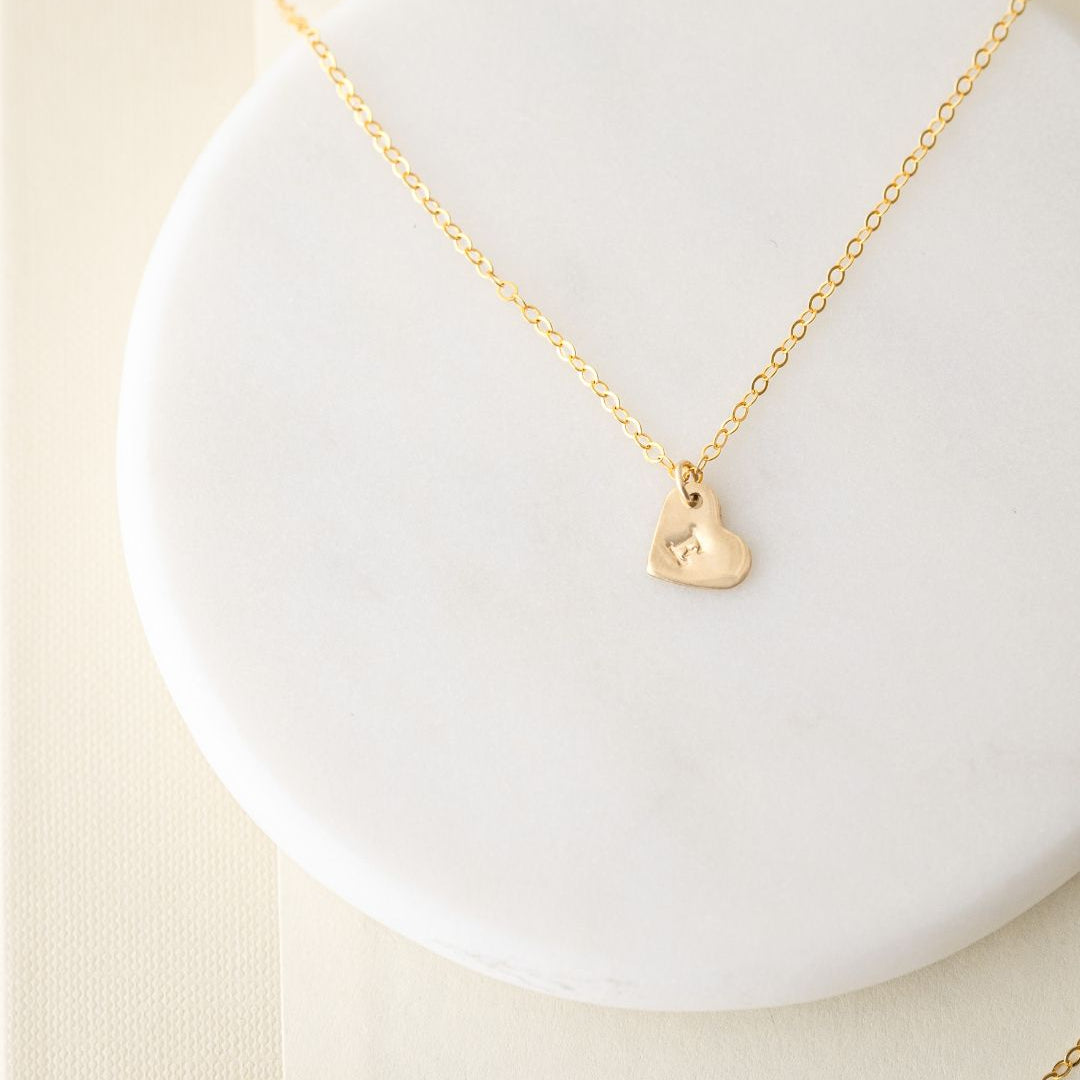 Dainty heart charm with a hand-stamped initial. A soft, subtle reminder of the bond that matters most.