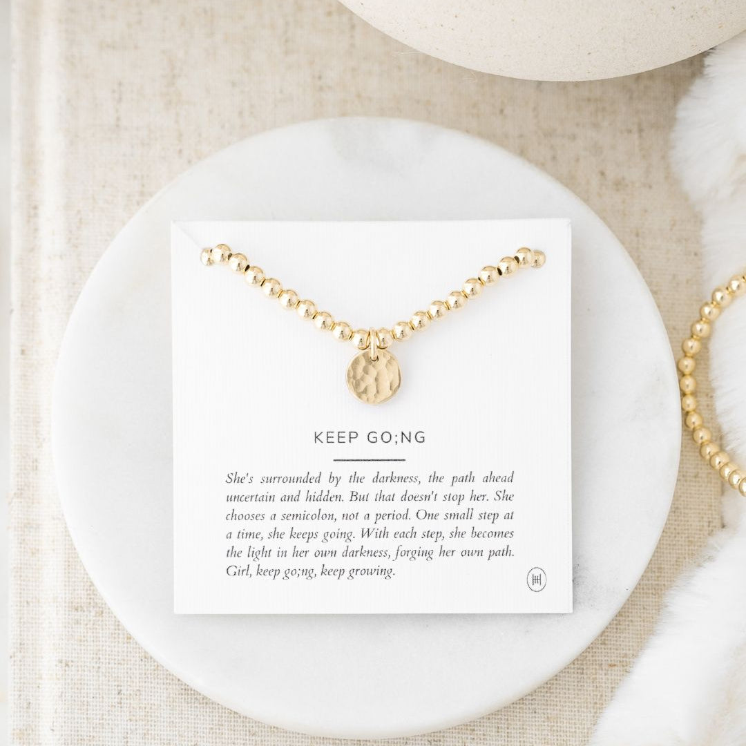 Her friend gifted her the Keep Go;ng necklace as a reminder for the quiet moments—when she’s folding laundry with tears in her eyes or feeling like she can’t take another step.
