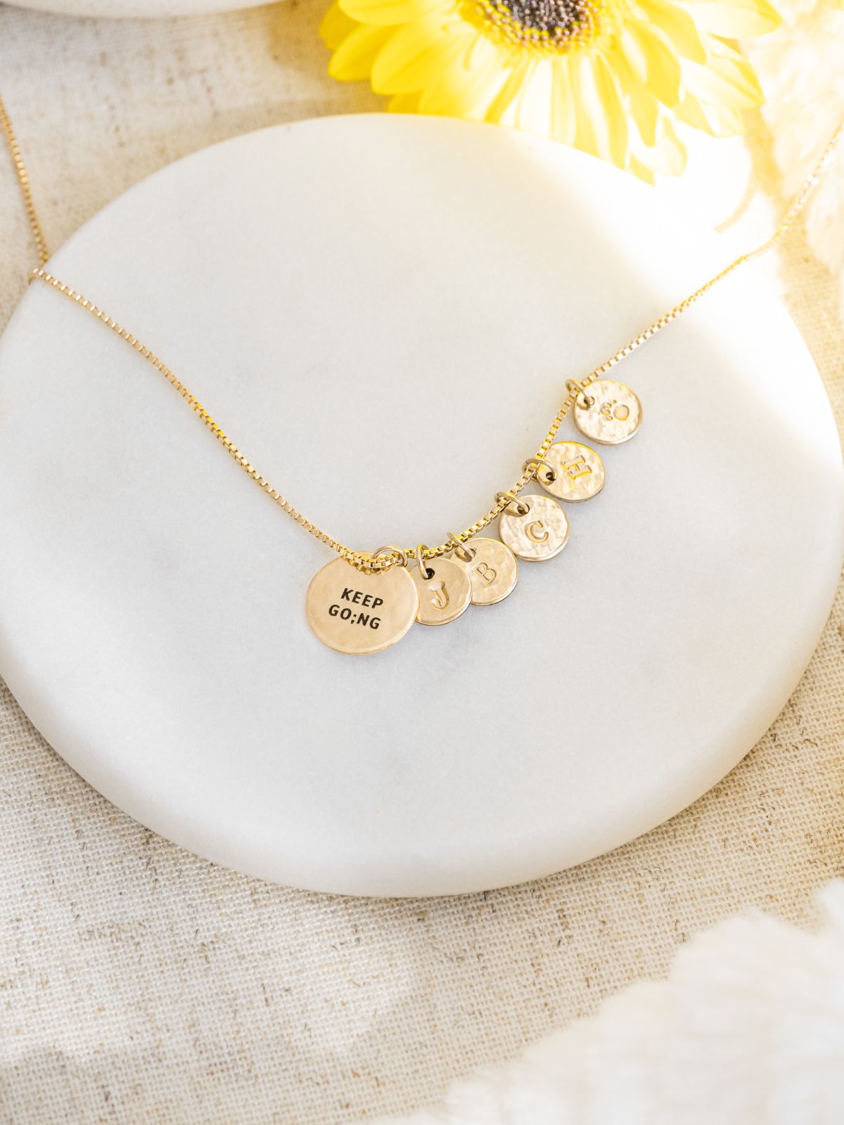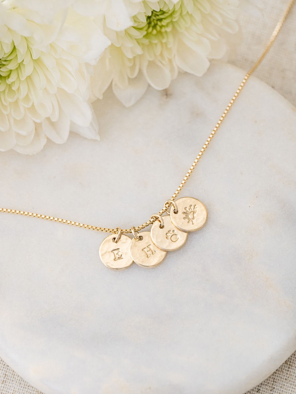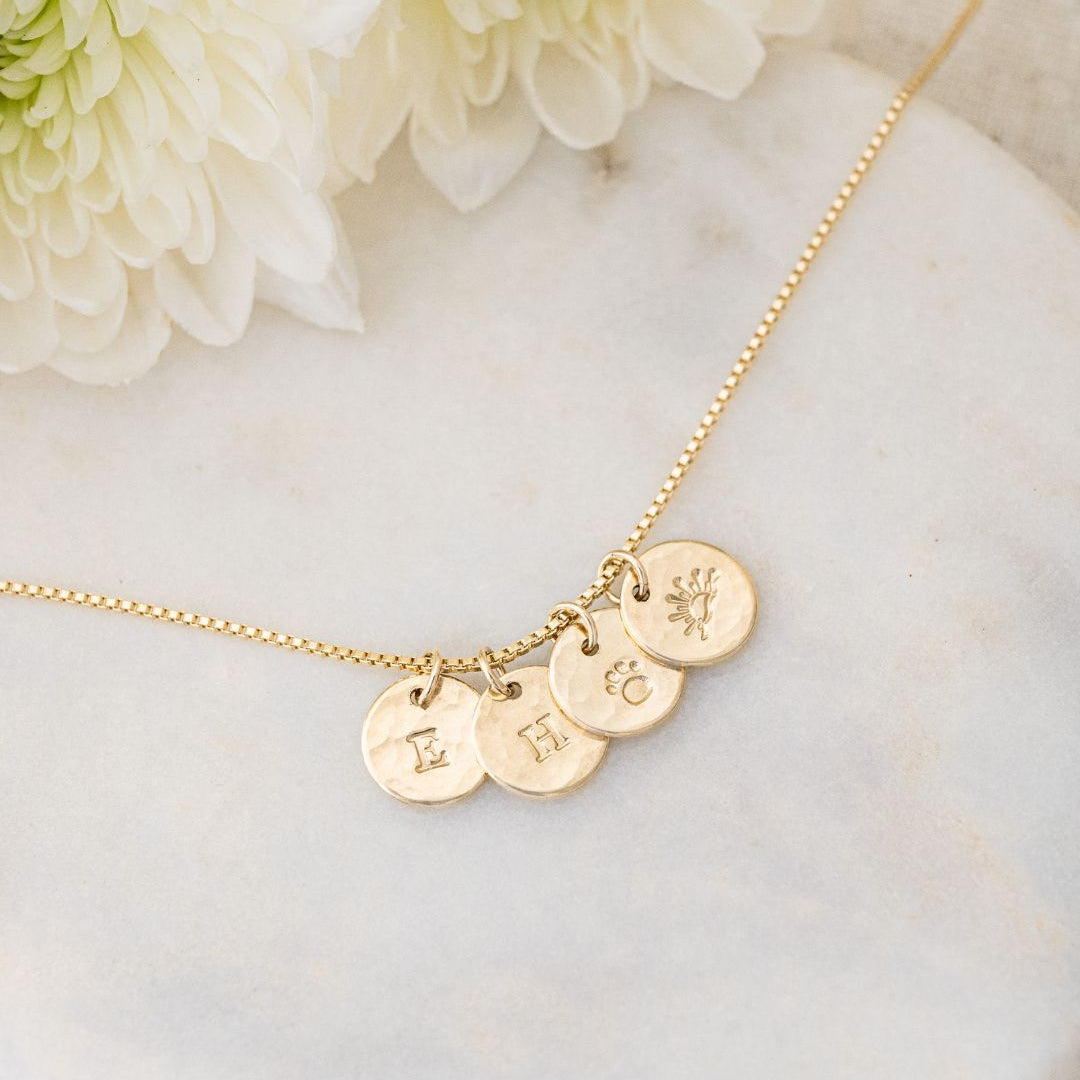 Up to six hammered coin charms, each with hand-stamped initial or symbol.
