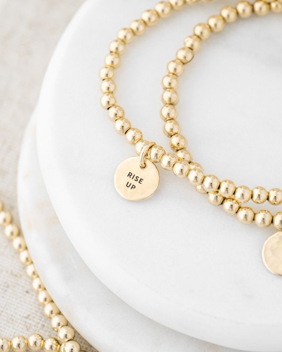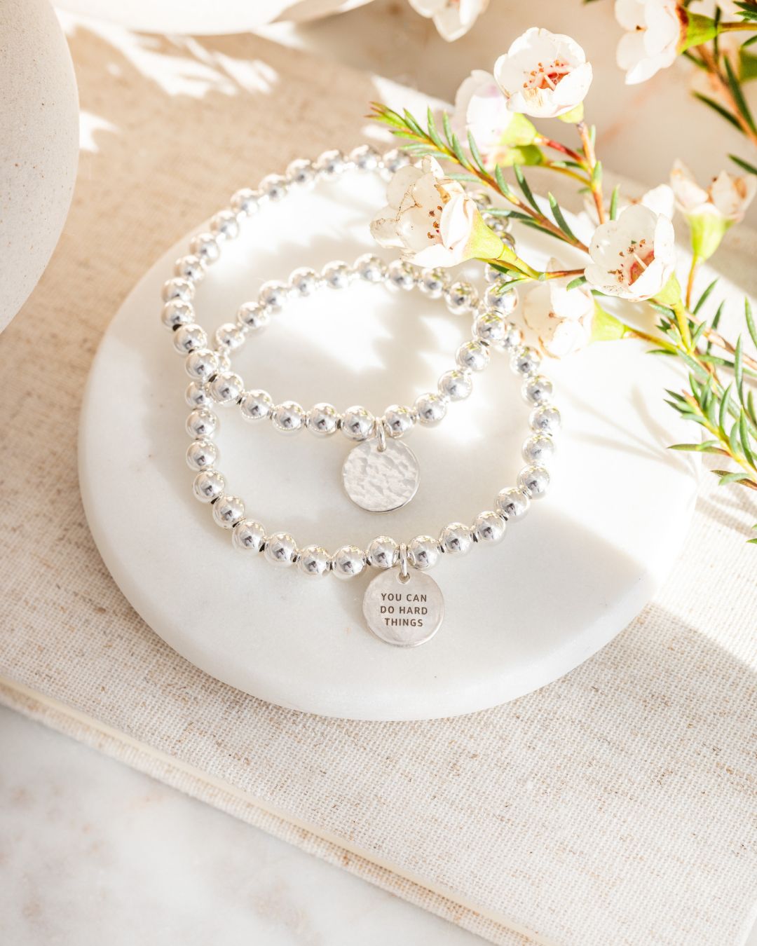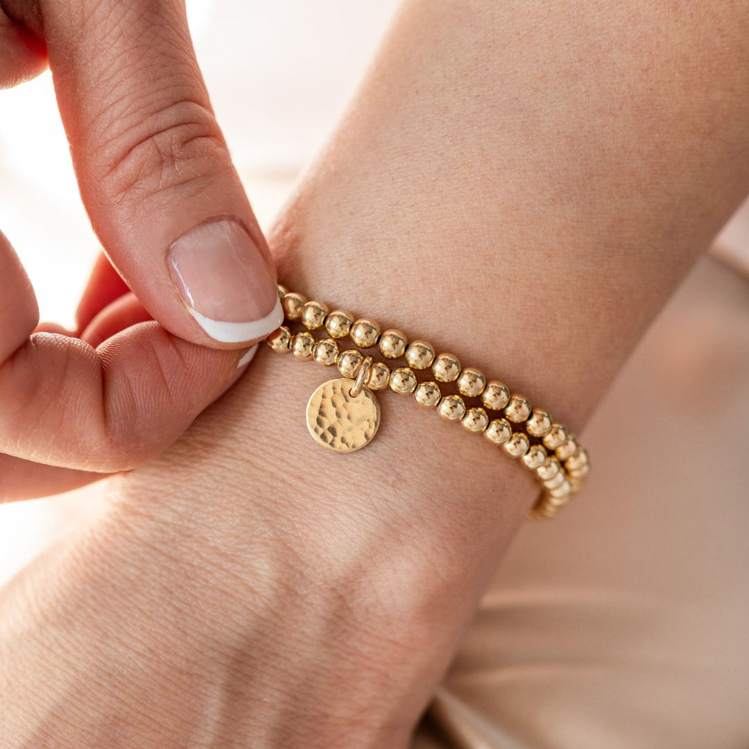 A hammered coin charm on a stretch beaded bracelet. Effortless and elegant—the ultimate everyday piece.