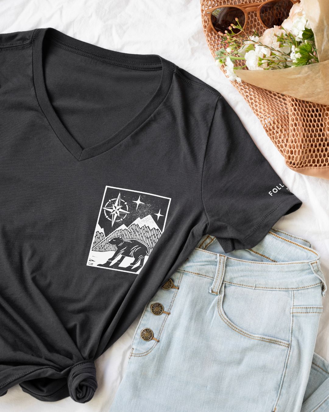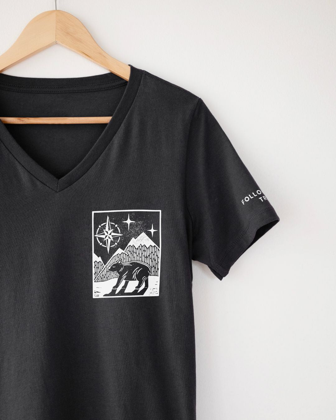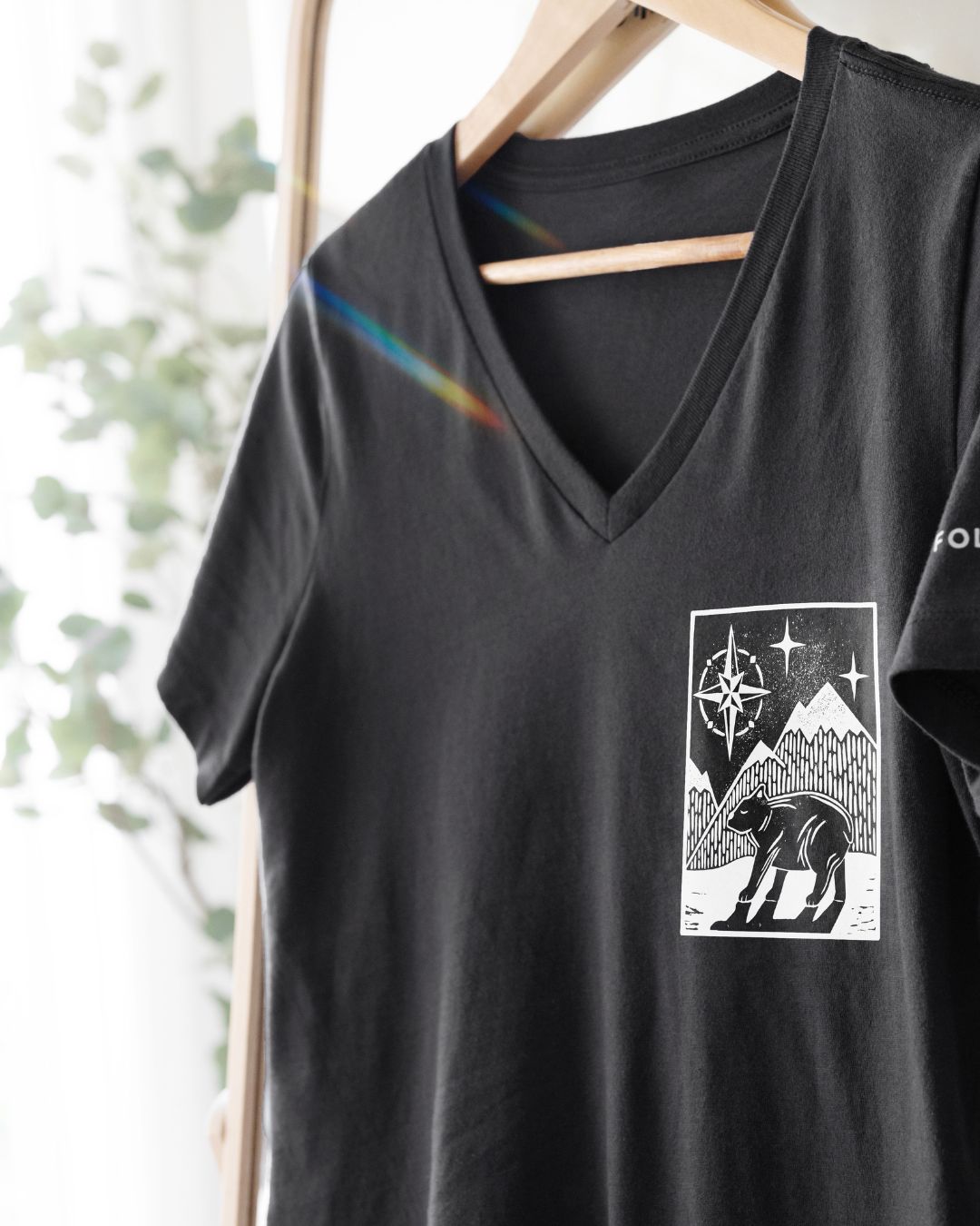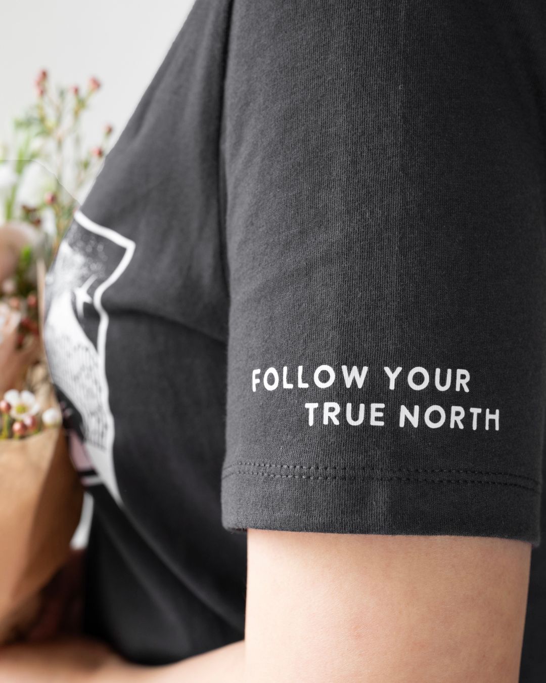 Featuring a beautifully hand-carved linocut print of a bear following its true north, this shirt symbolizes strength, independence, and the courage to forge your own path. The left sleeve carries the empowering affirmation "Follow Your True North," a gentle reminder to stay true to yourself and your unique direction.