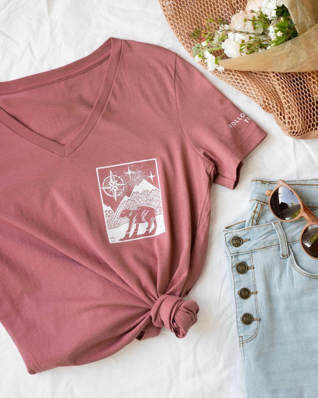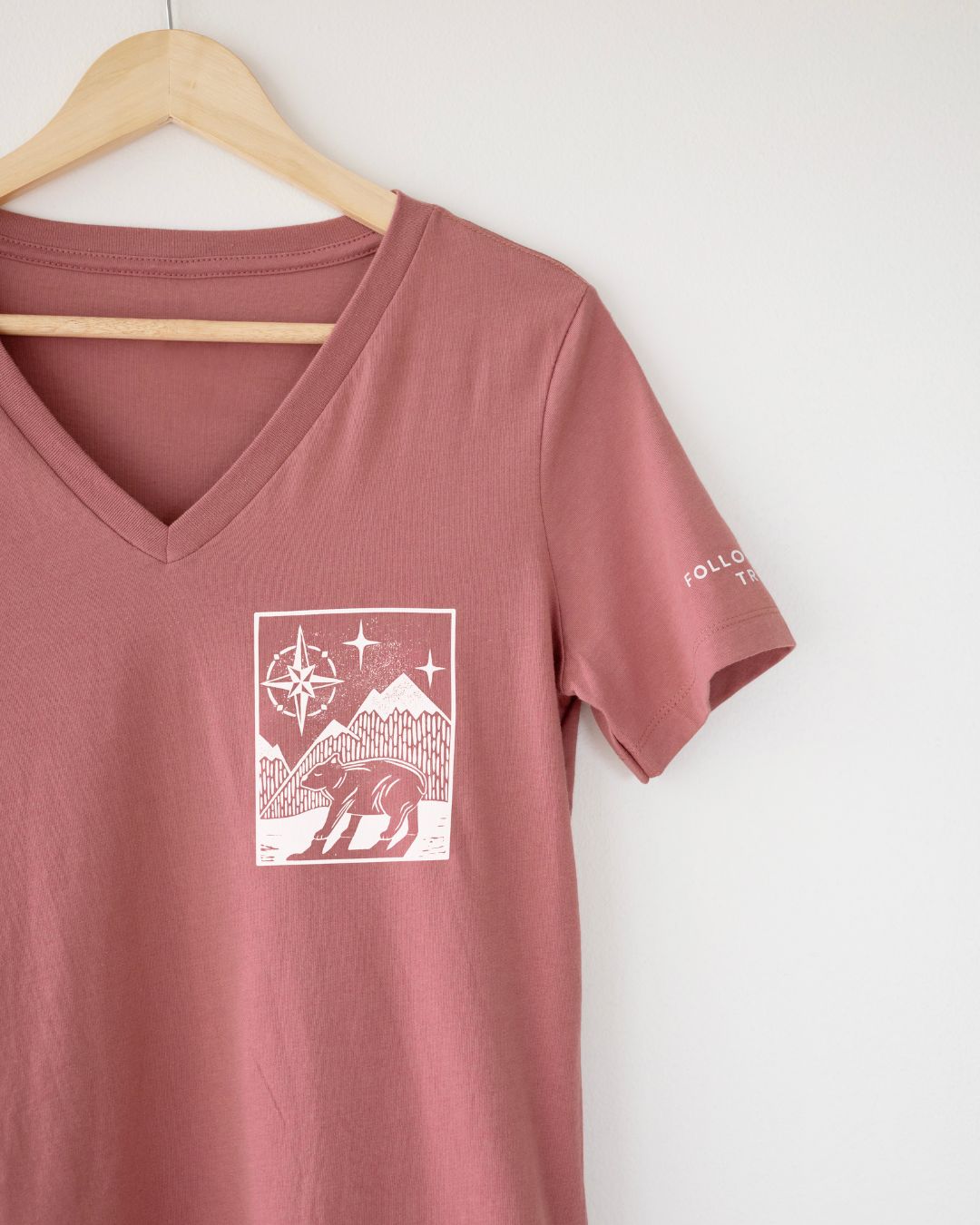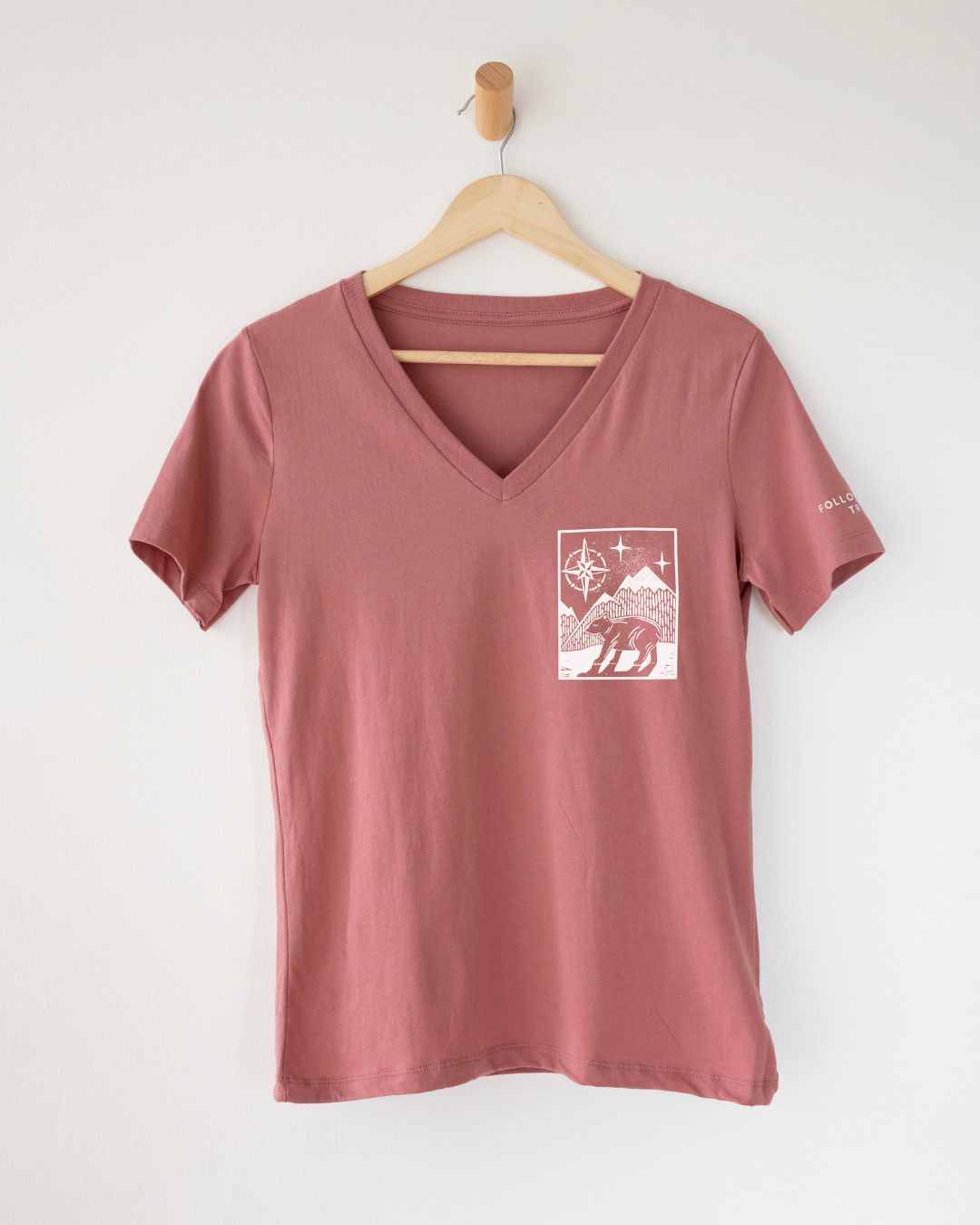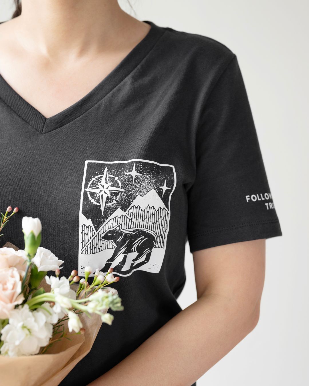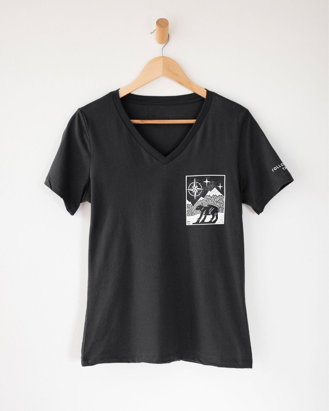 Featuring a beautifully hand-carved linocut print of a bear following its true north, this shirt symbolizes strength, independence, and the courage to forge your own path. The left sleeve carries the empowering affirmation "Follow Your True North," a gentle reminder to stay true to yourself and your unique direction.