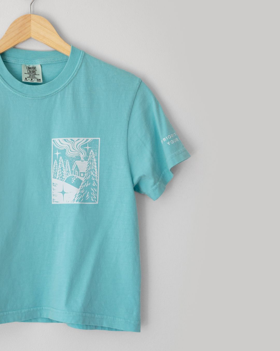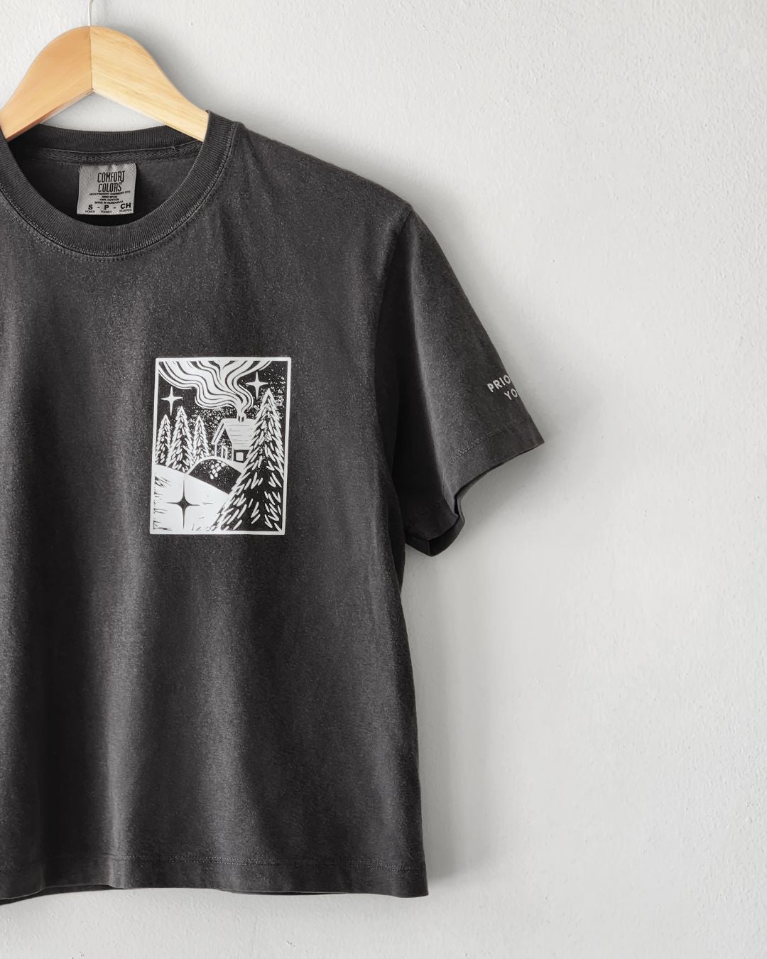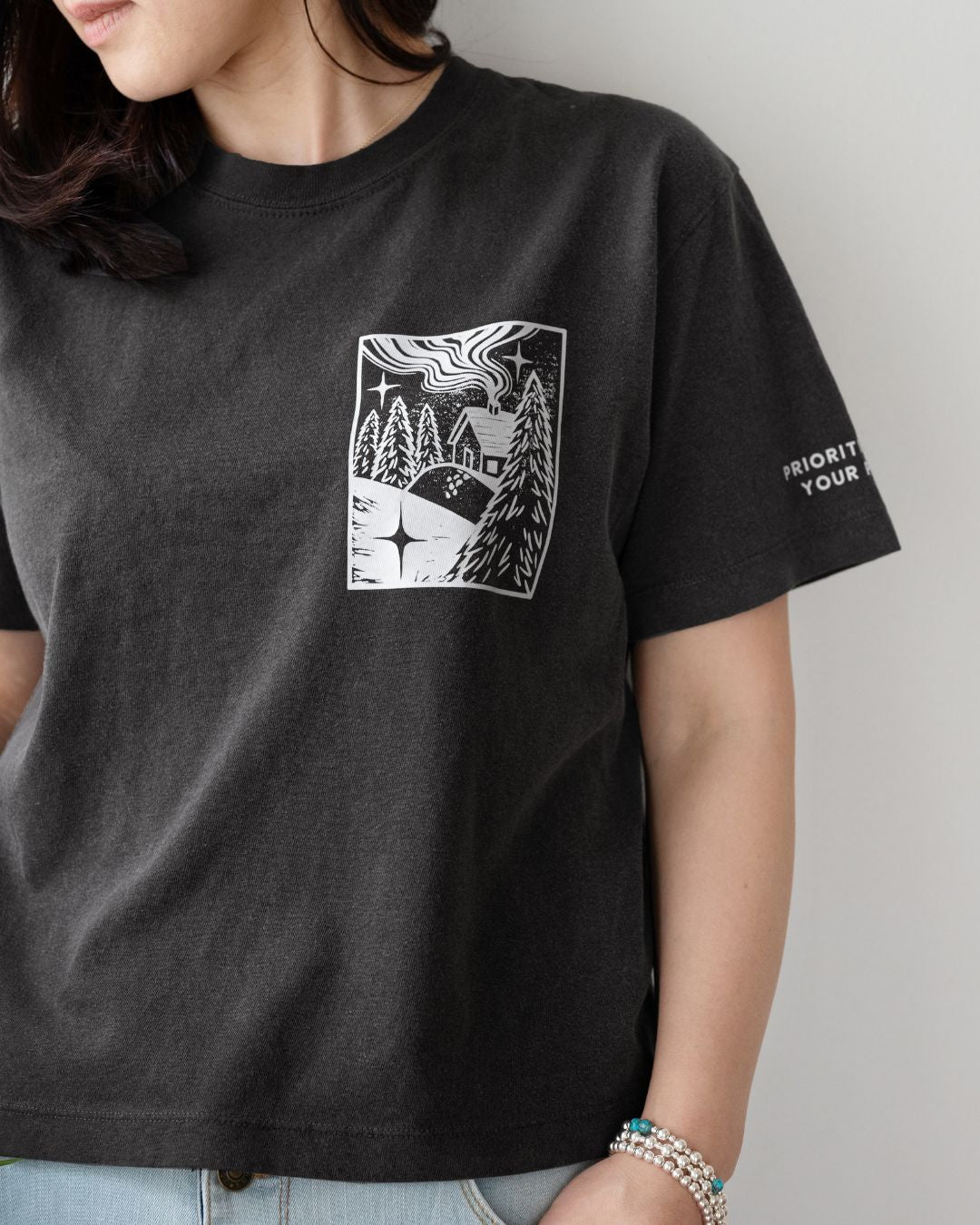 Embrace tranquility and self-care with our "Prioritize Your Peace" Positive Vibes Tee. Featuring a hand-carved linocut design of a cozy cabin nestled in a forest, this tee symbolizes the importance of inner calm and self-love. The discreet affirmation on the sleeve, "Prioritize Your Peace," serves as a gentle reminder to nurture your mental well-being.