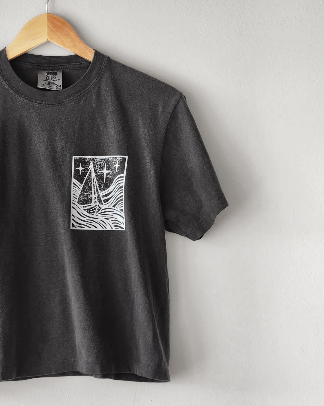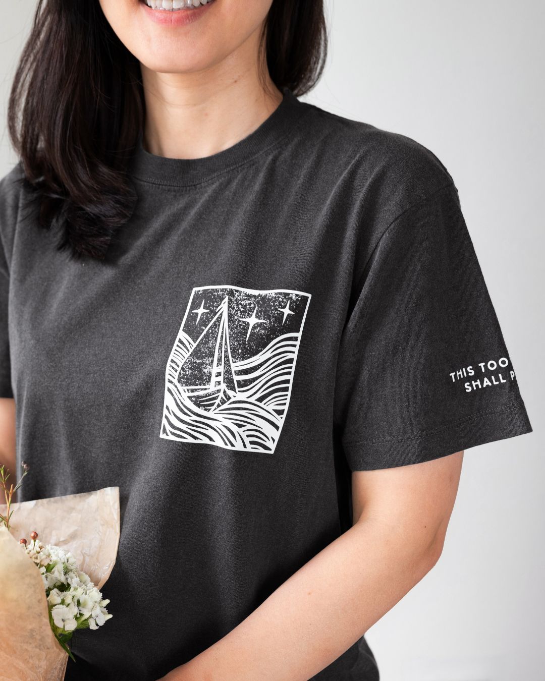 Embrace resilience and hope with our "This Too Shall Pass" Positive Vibes Tee. Featuring a hand-carved linocut design of a sailboat navigating a stormy ocean, this tee symbolizes strength and perseverance. The discreet affirmation on the sleeve, "This Too Shall Pass," offers a gentle reminder that tough times are temporary.
