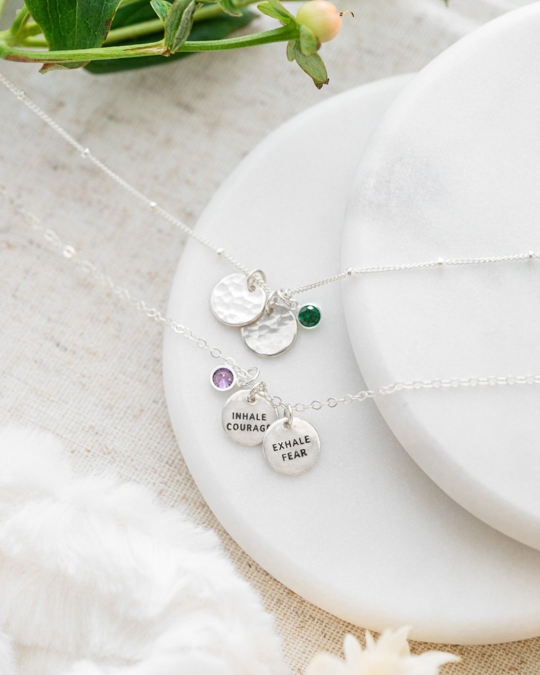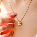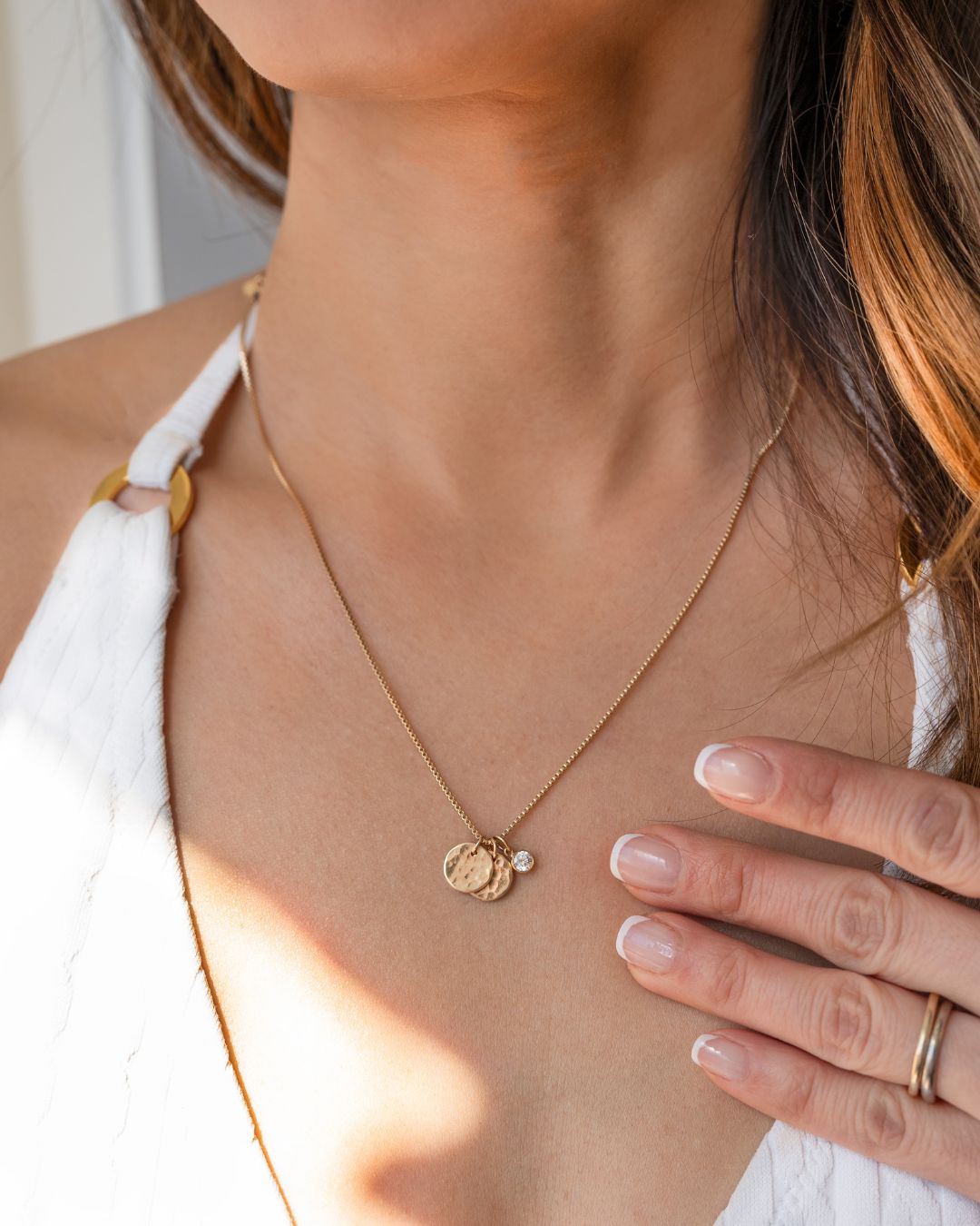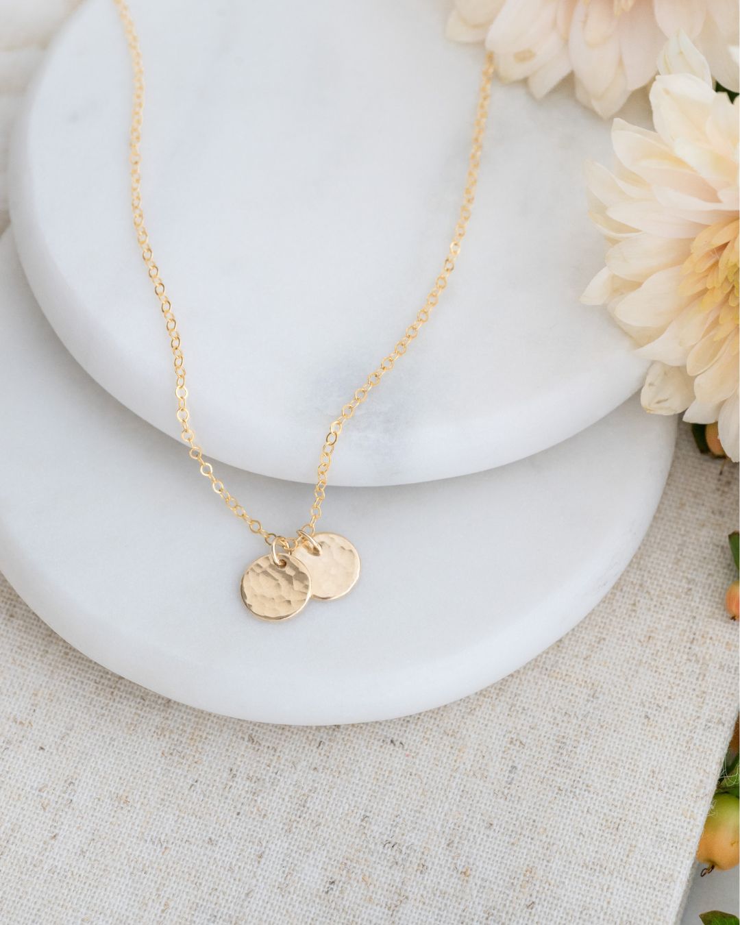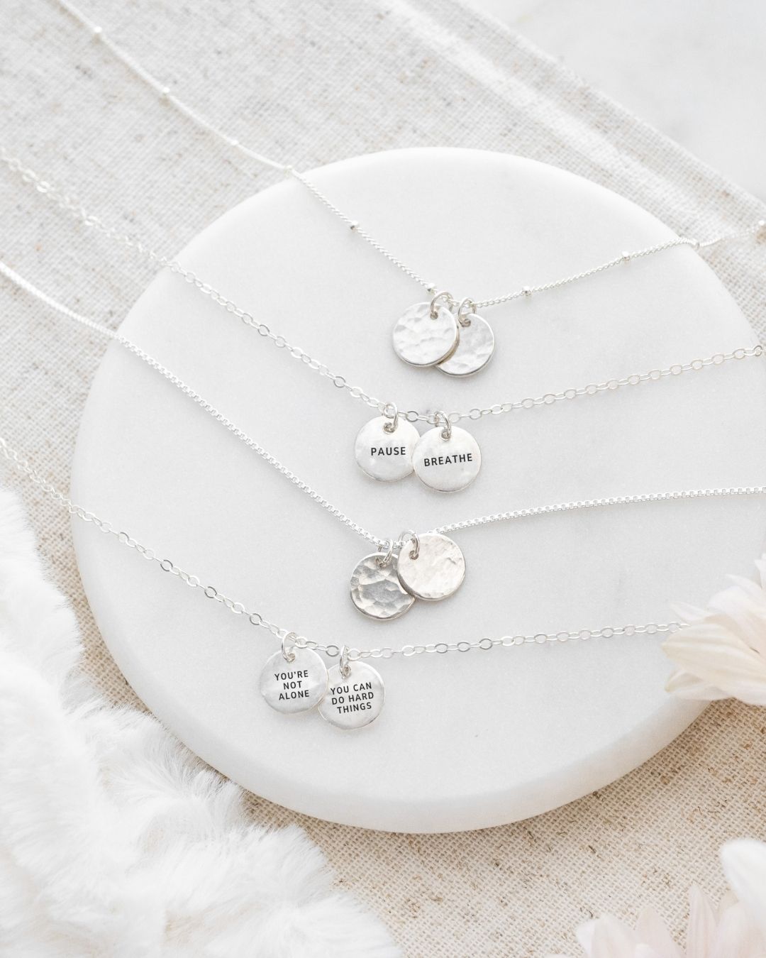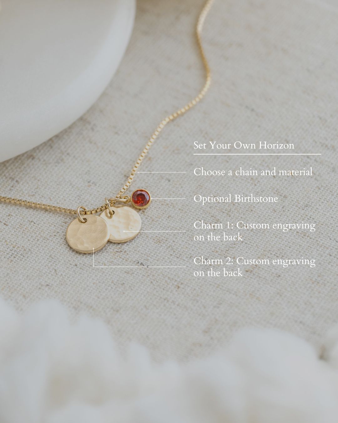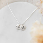 This necklace is a quiet, personal companion for your journey, carrying two hand-hammered Mini Luna coins, each engraved with a meaningful message—one for each side of your path.