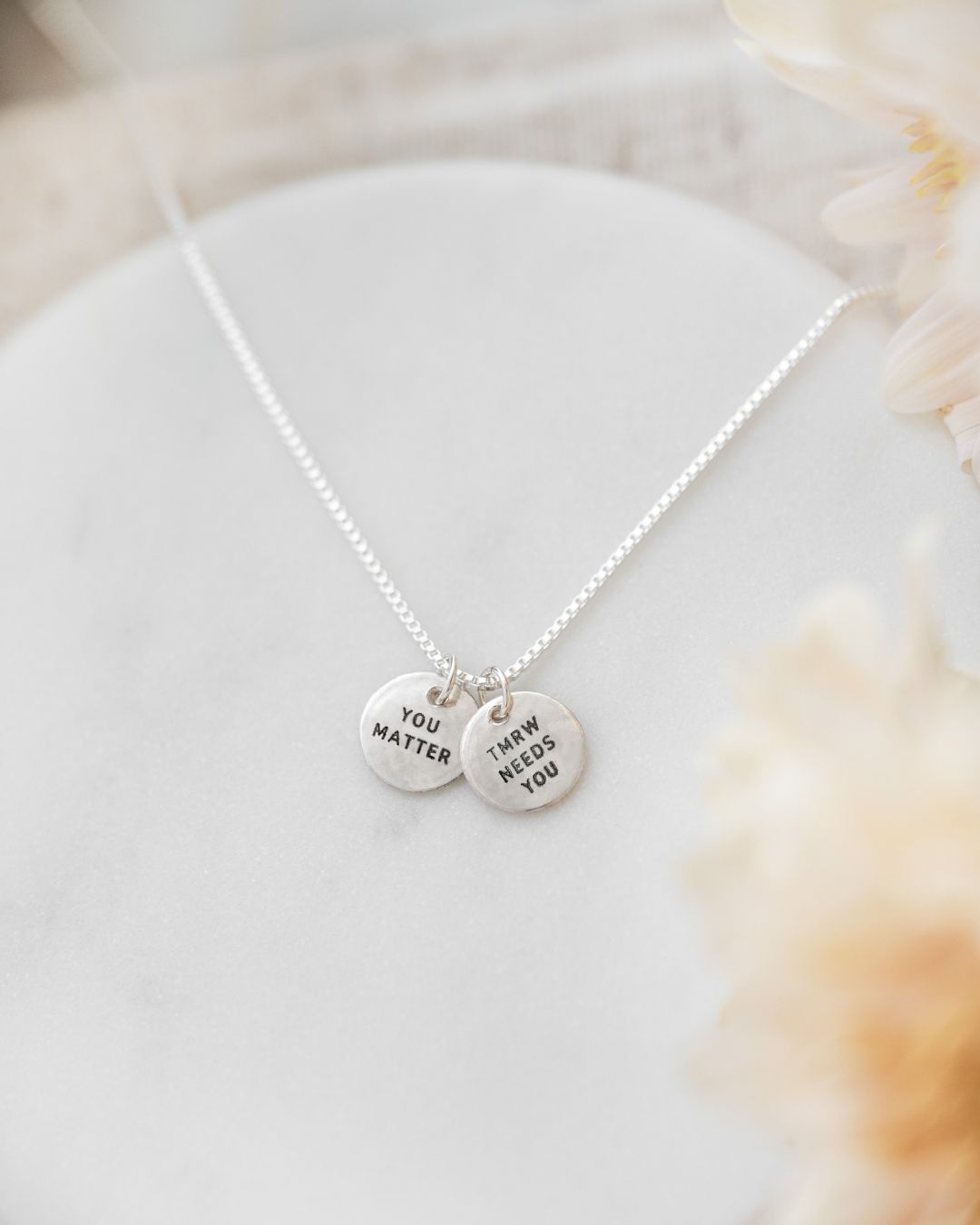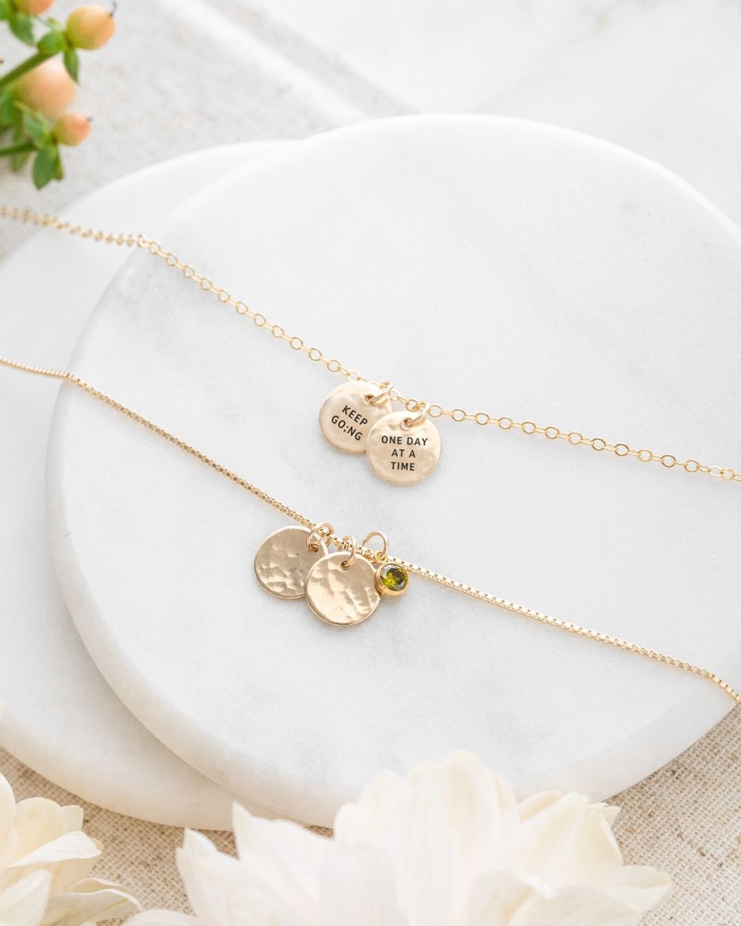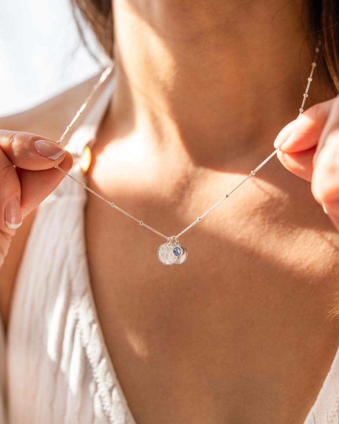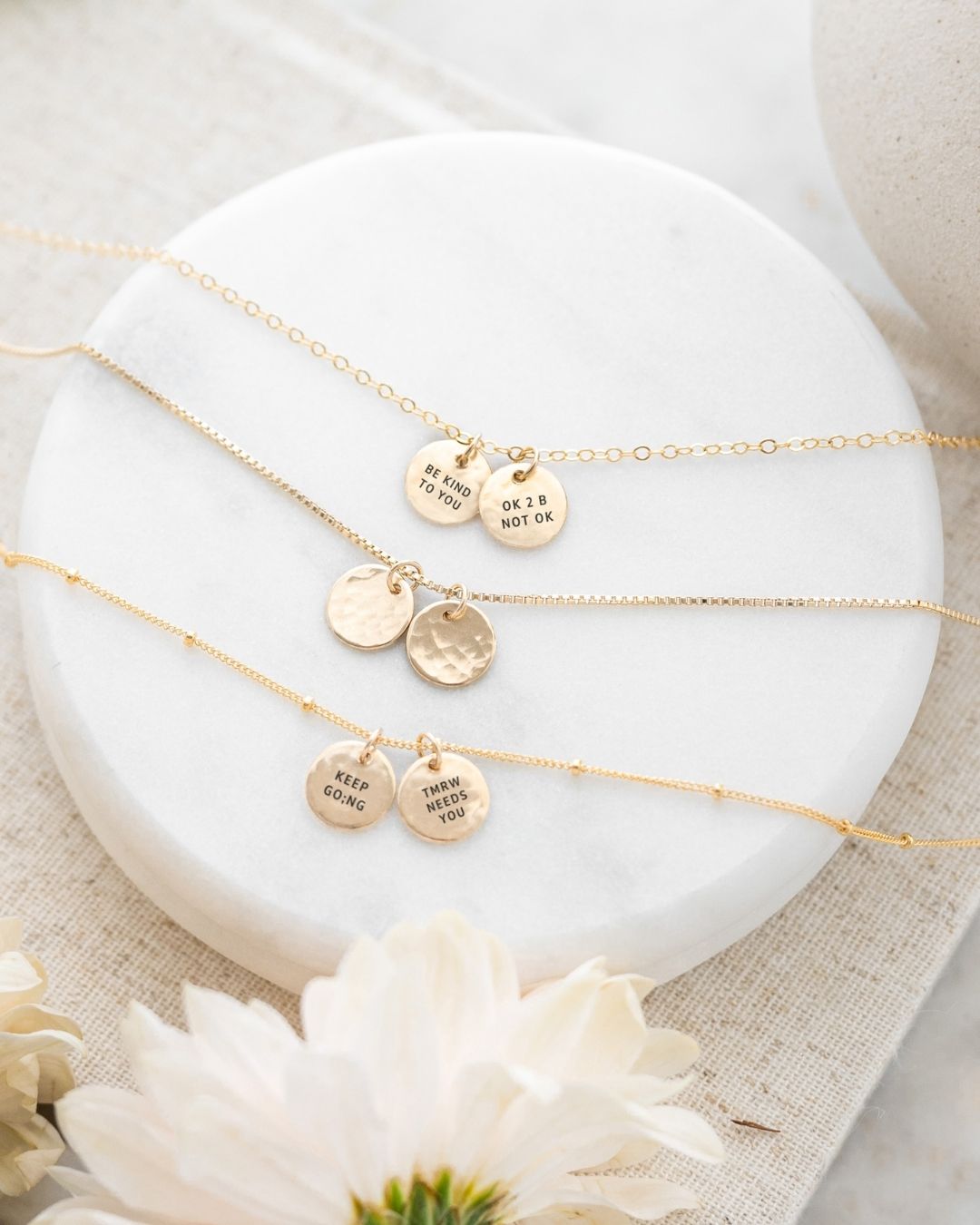 This necklace is a quiet, personal companion for your journey, carrying two hand-hammered Mini Luna coins, each engraved with a meaningful message—one for each side of your path.