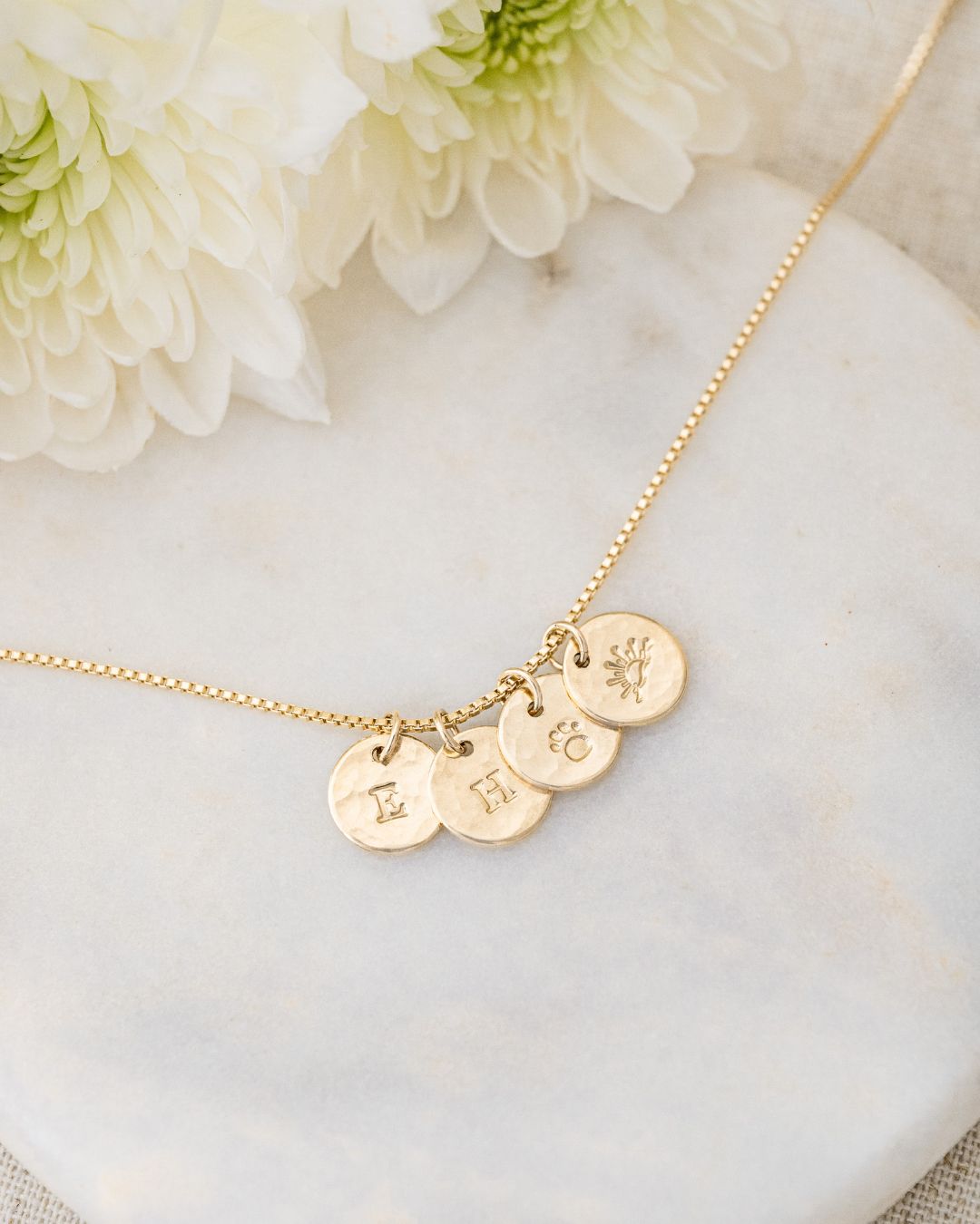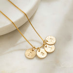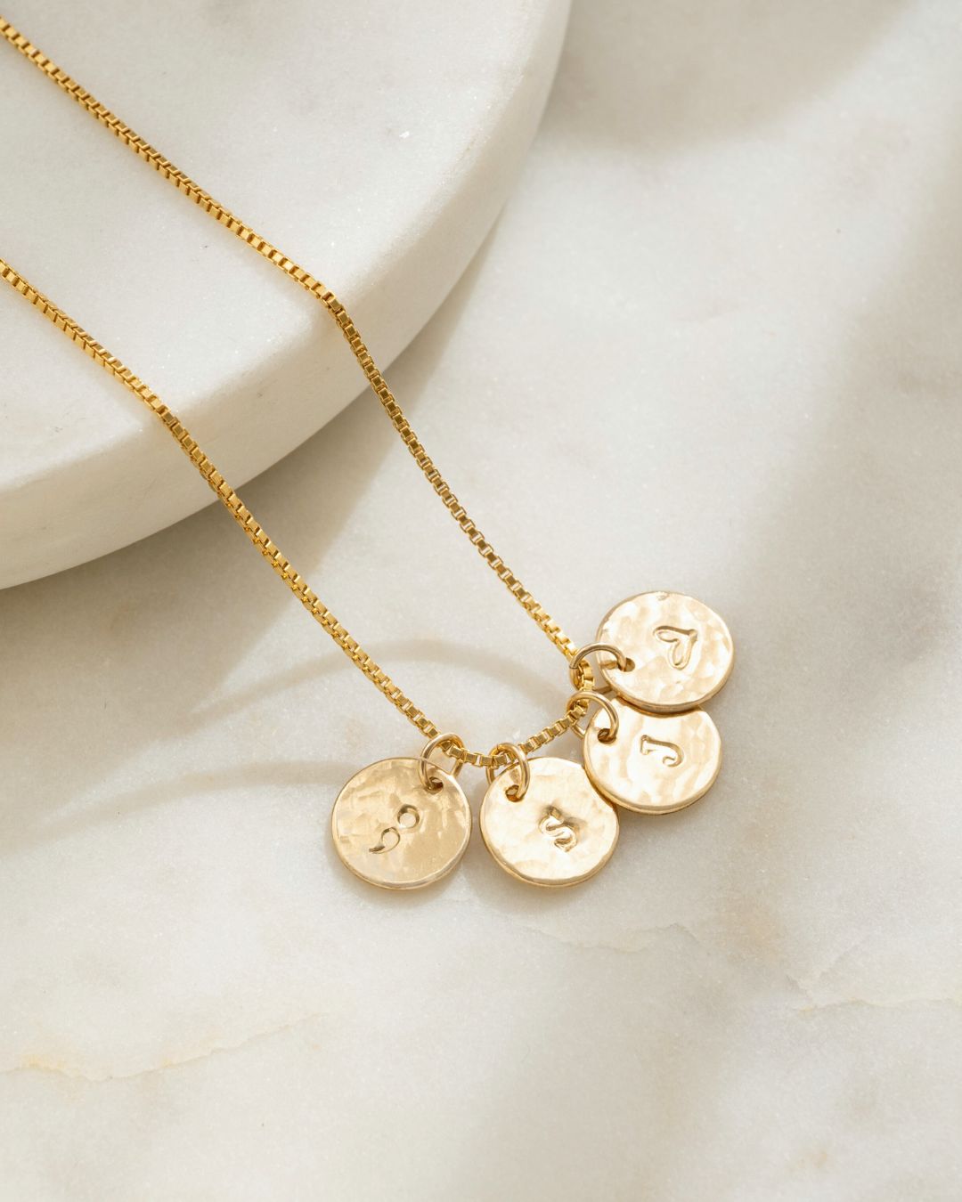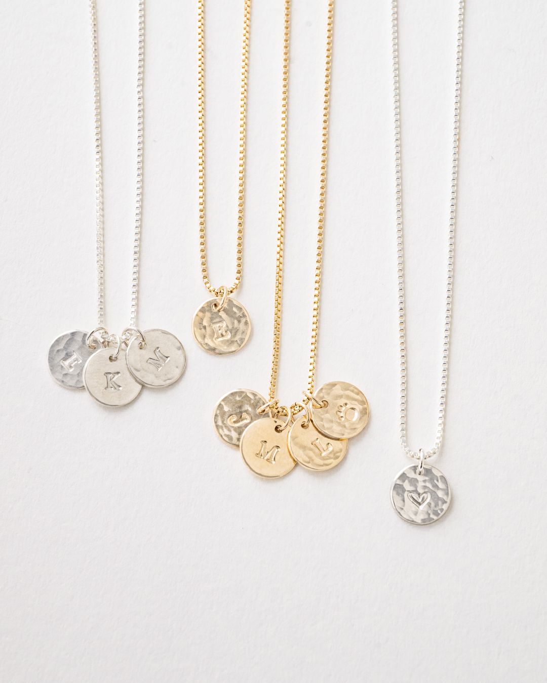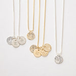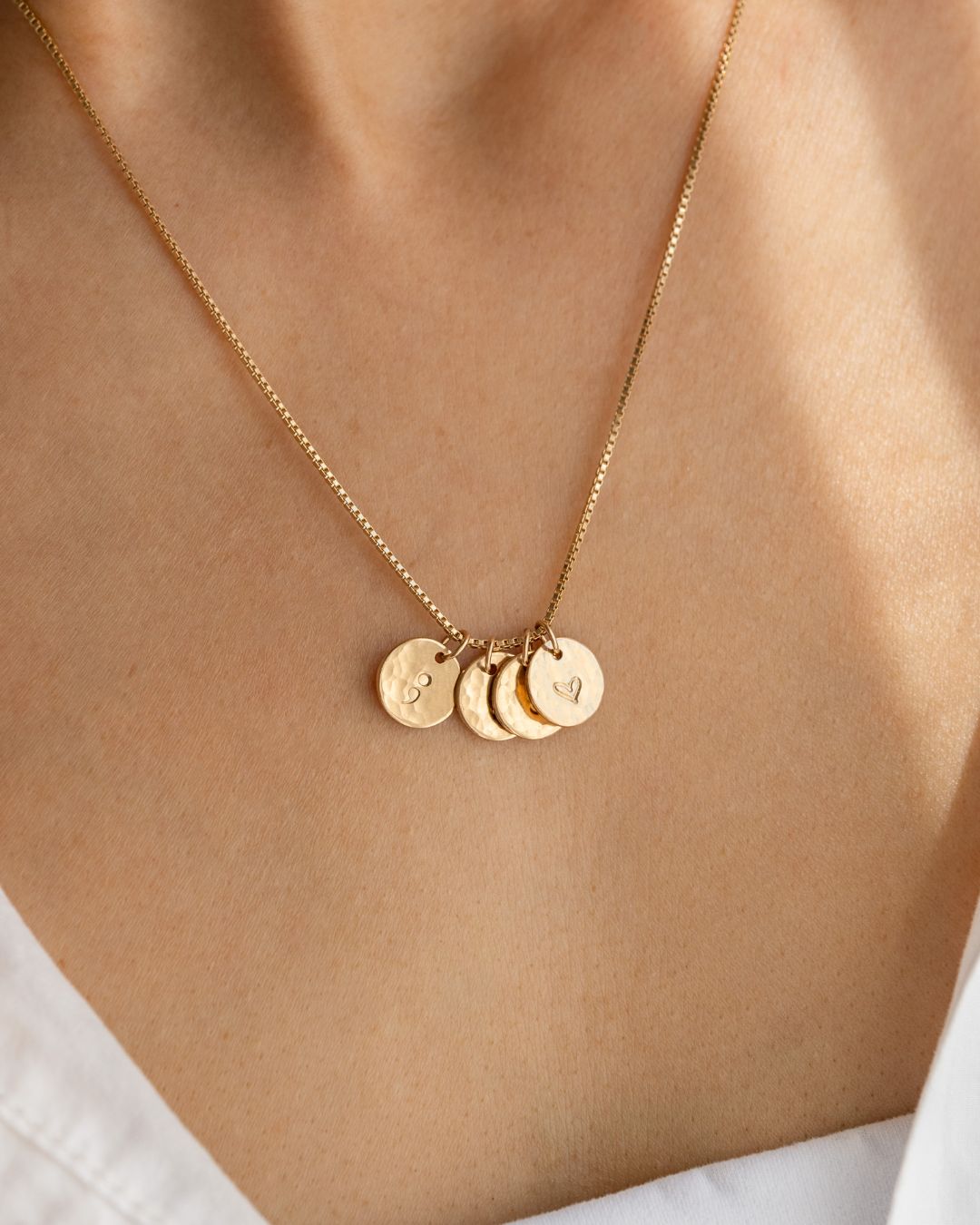Add one or more hammered charms to create your own cluster of stars, strung on a Venetian chain that’s elegant, durable, and full of meaning.