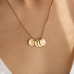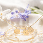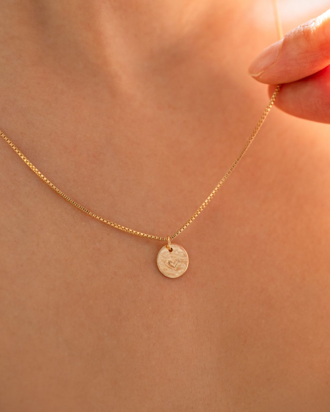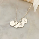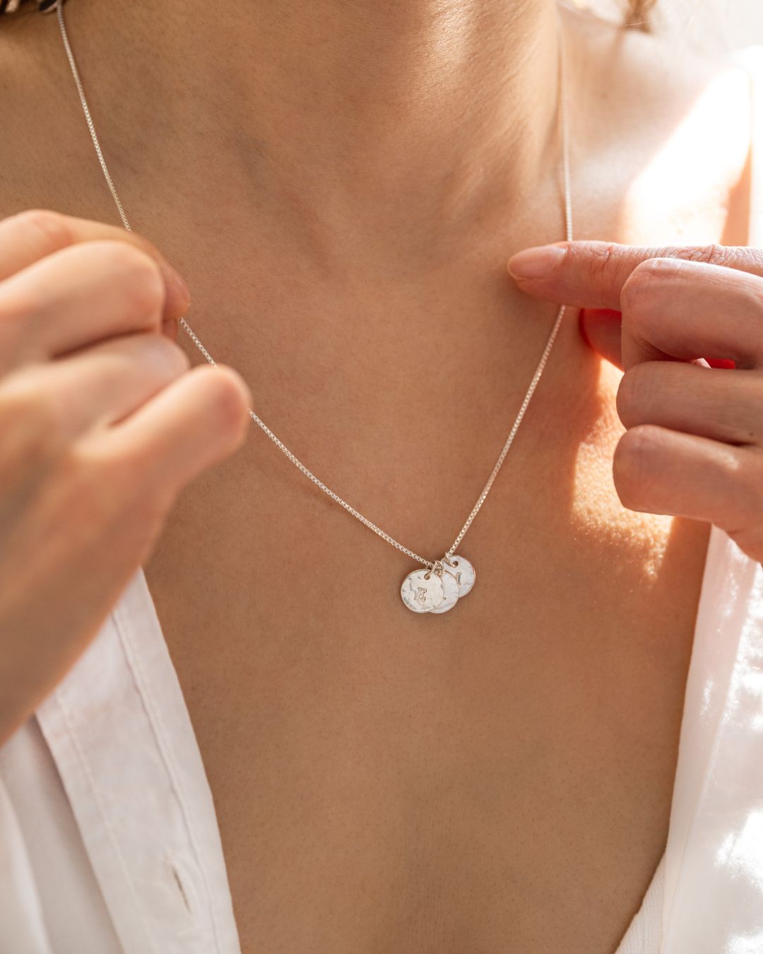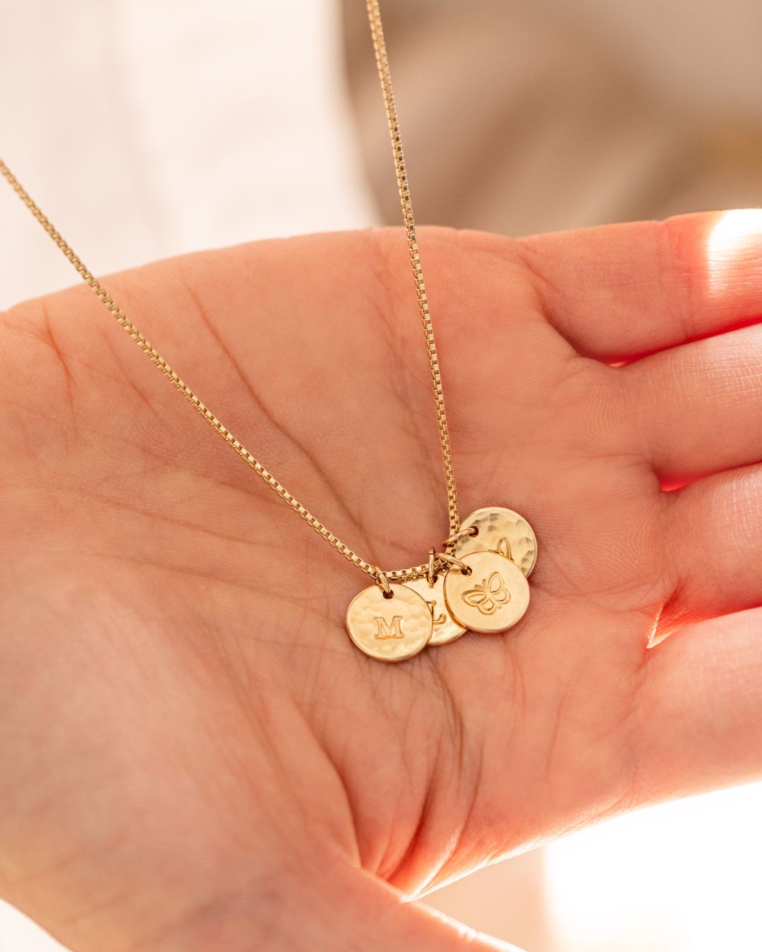 Add one or more hammered charms to create your own cluster of stars, strung on a Venetian chain that’s elegant, durable, and full of meaning.