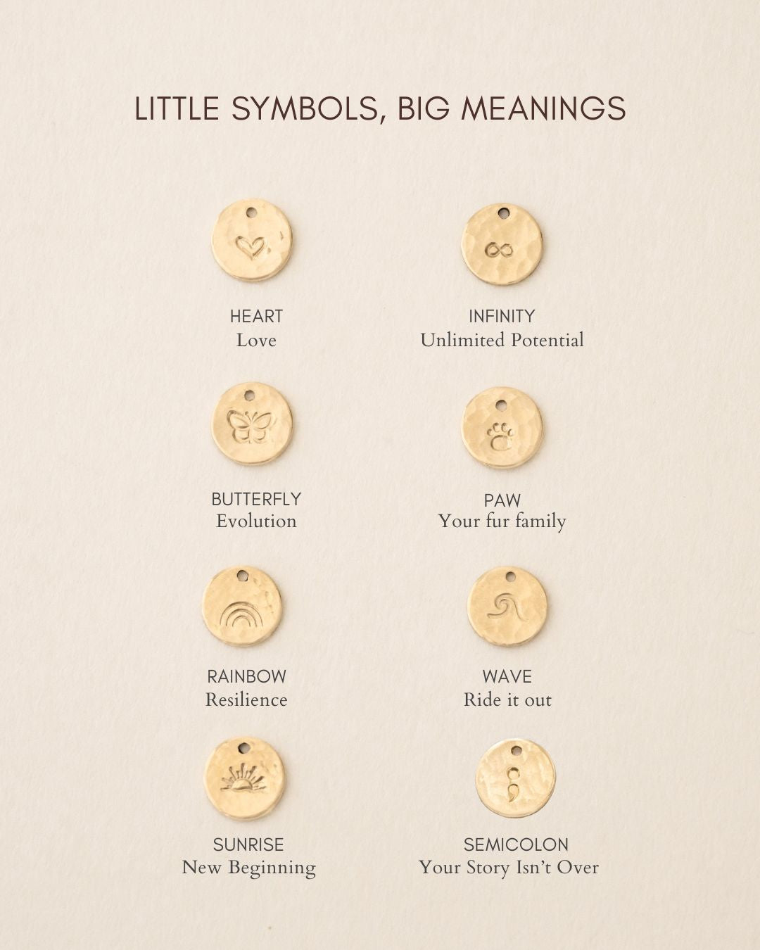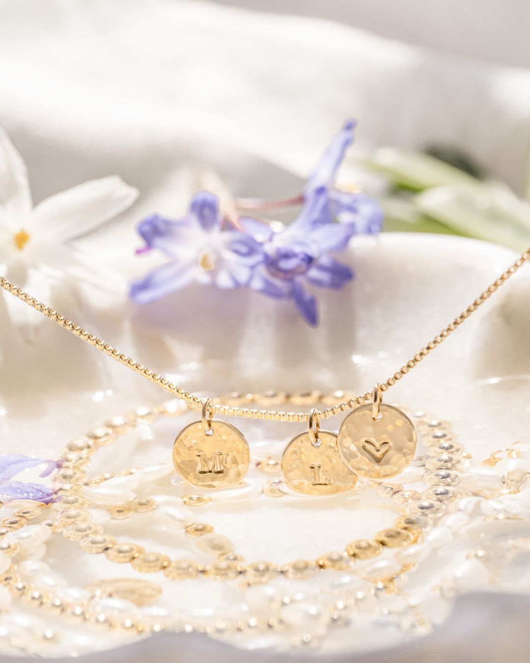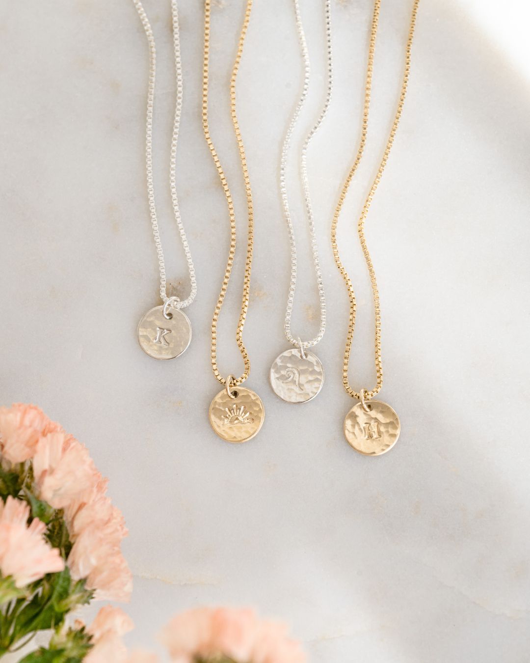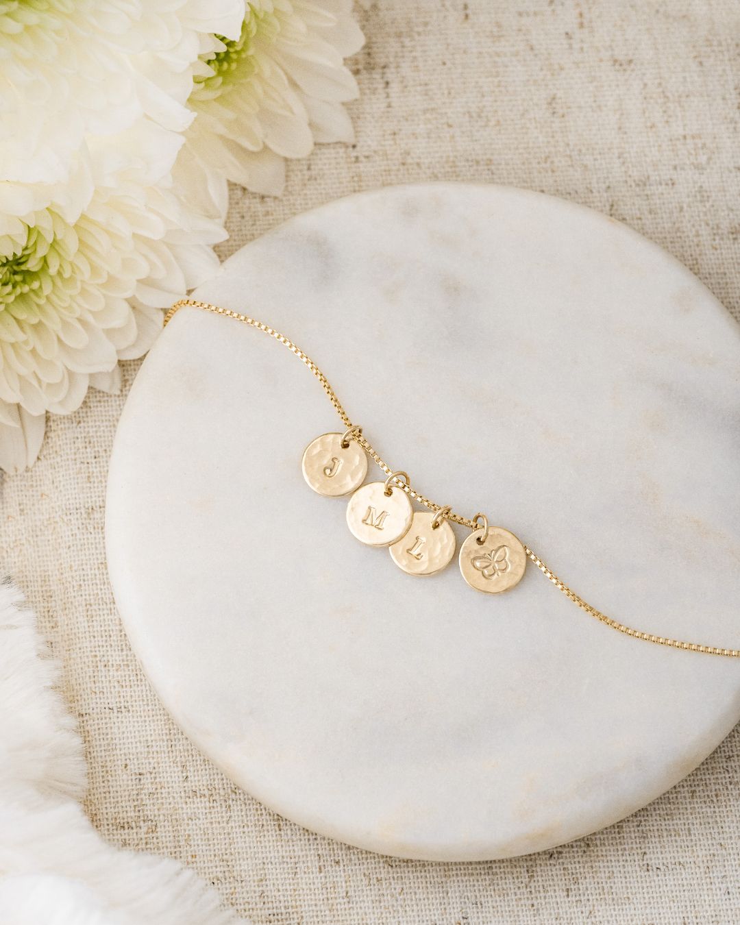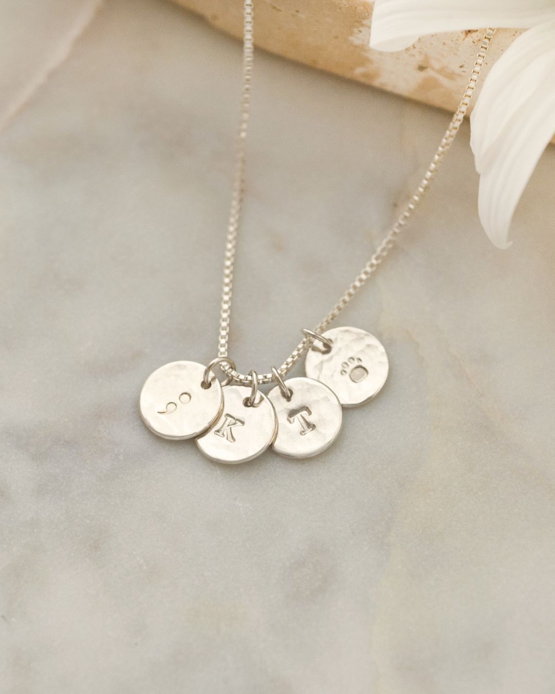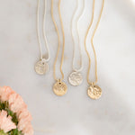 • Charm: 3/8" (9mm) disc, hand-hammered front with hand-stamped initial or symbol
