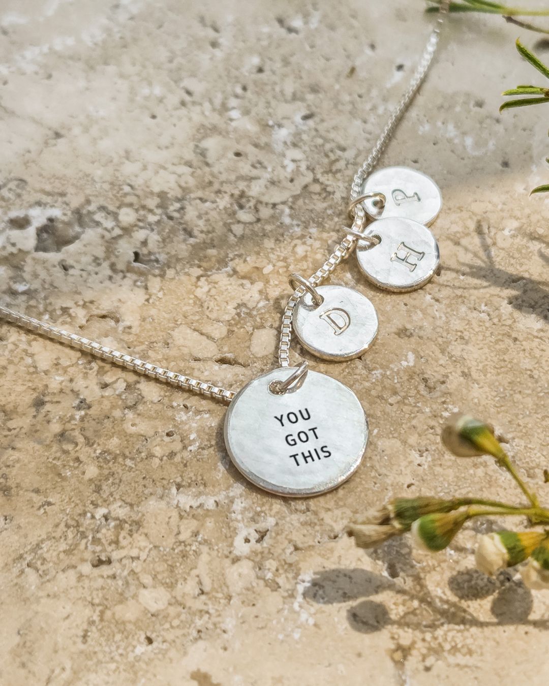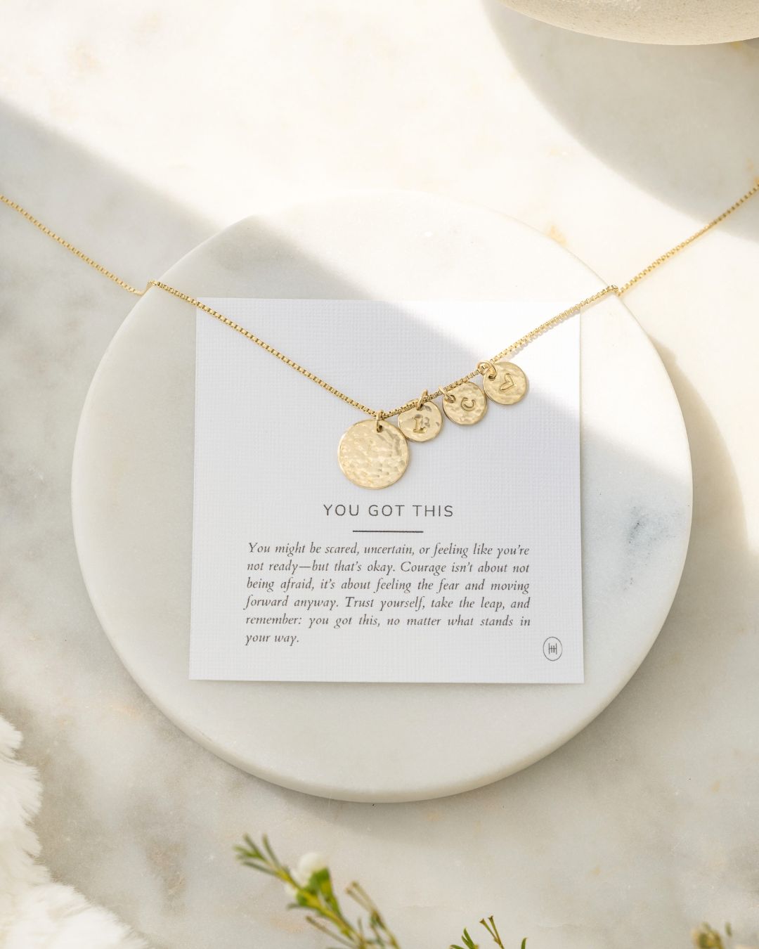 Featuring a hand-hammered heart charm engraved with “You Got This,” the Reya Necklace lets you add 1 to 6 personalized initial or symbol tags—each one representing someone who supports you or a part of yourself you’re reclaiming.