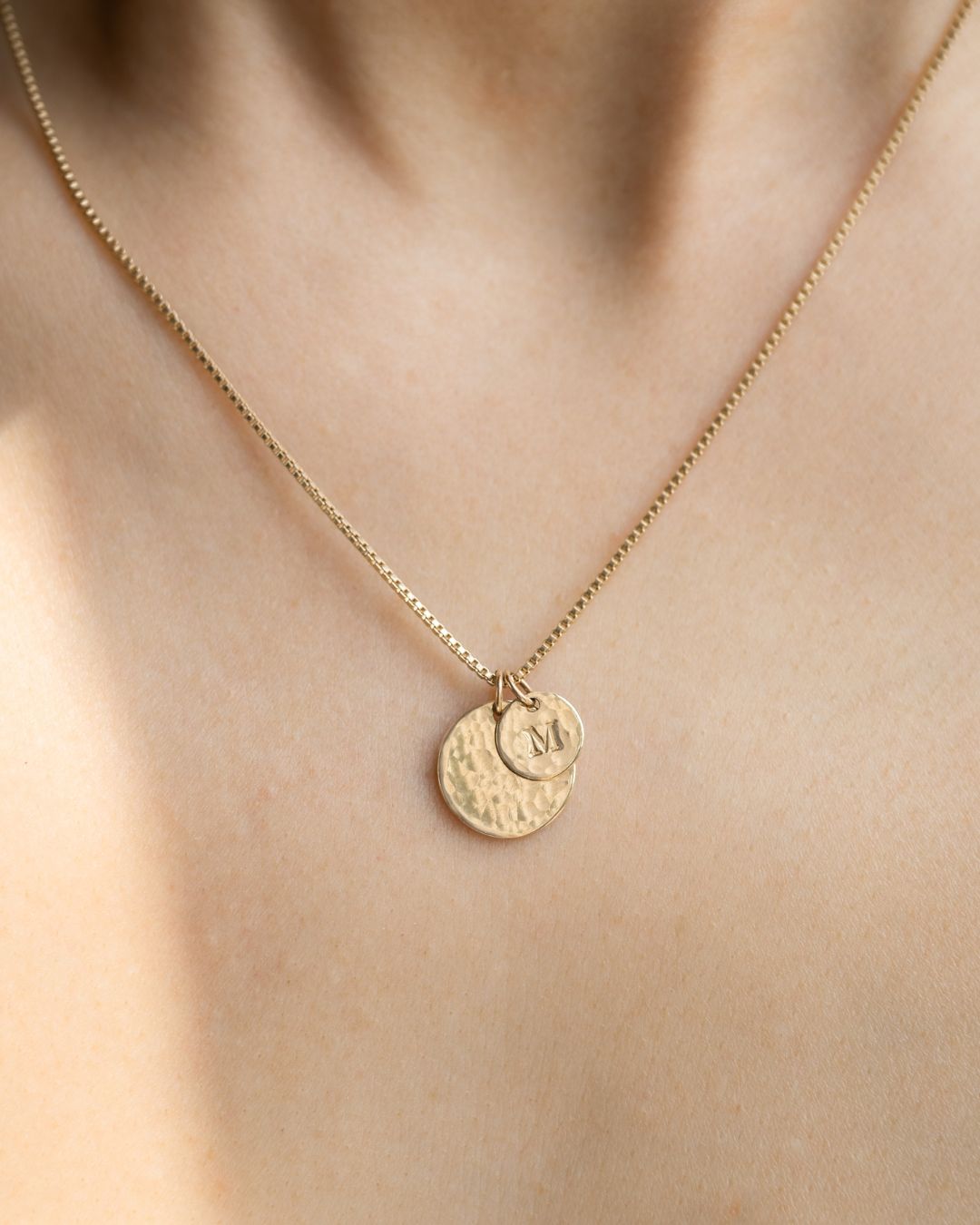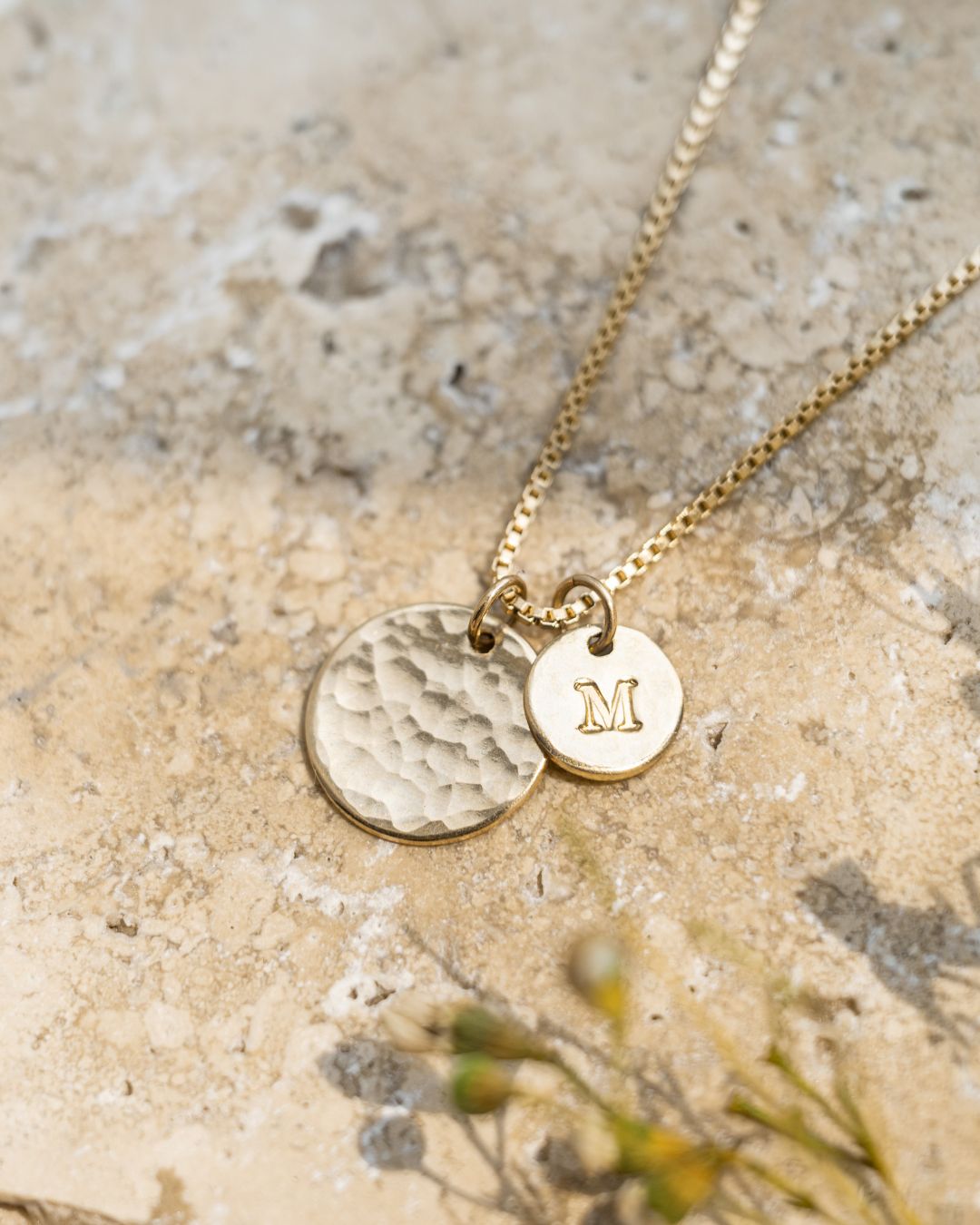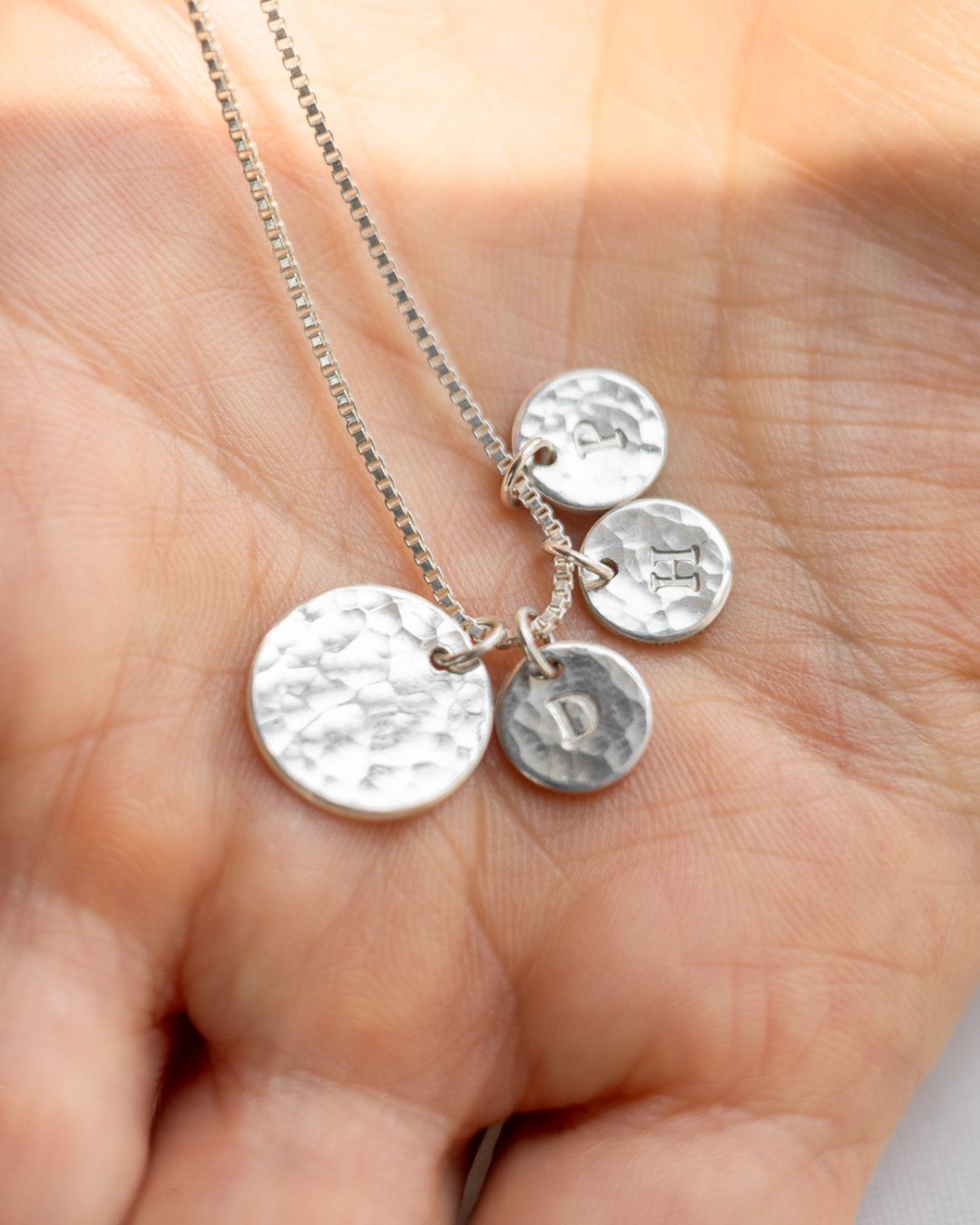 • Initial tags: 5/16" (6mm) disc, hand-hammered front with hand-stamped initial or symbol