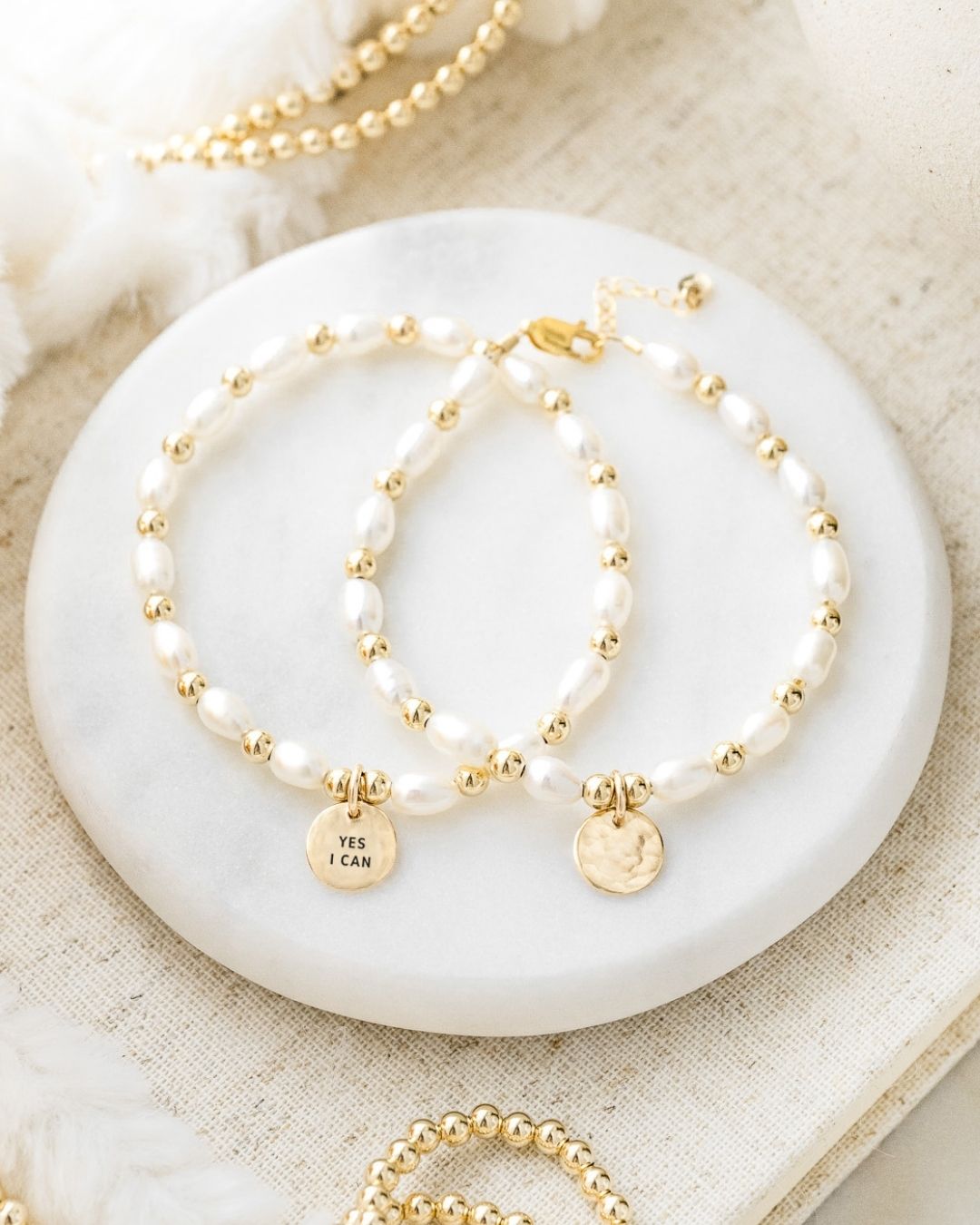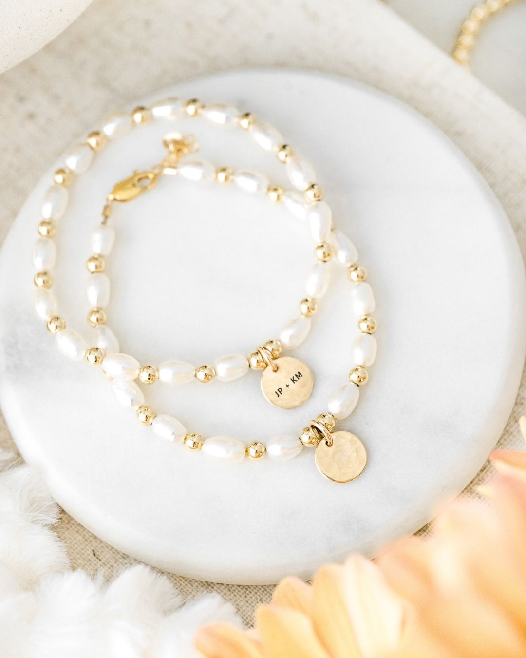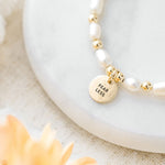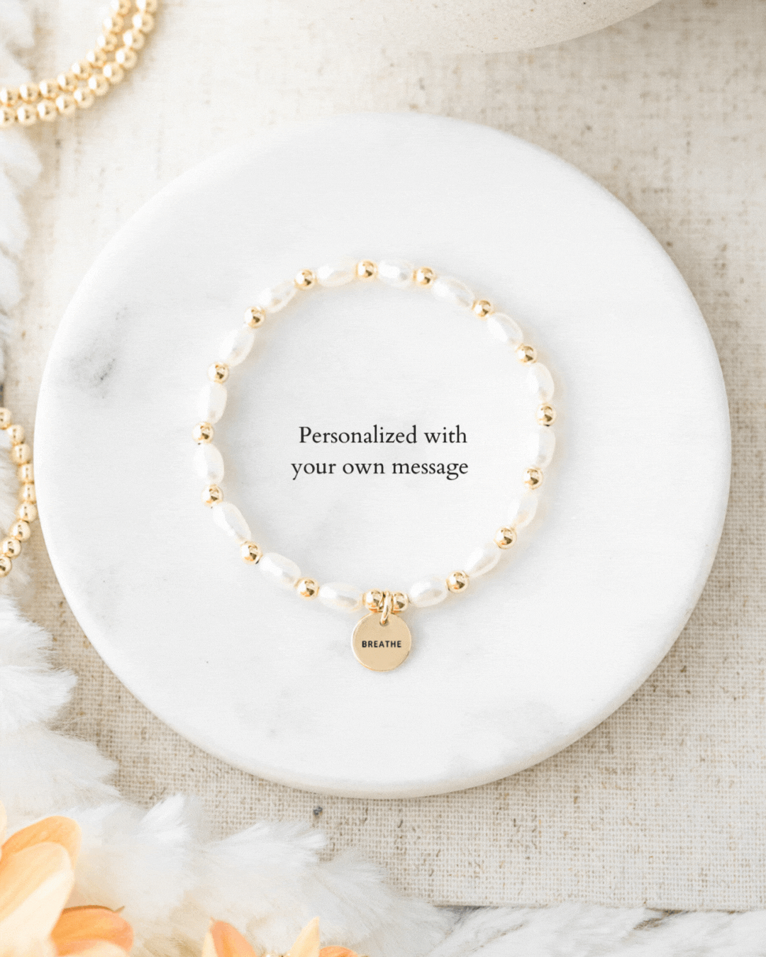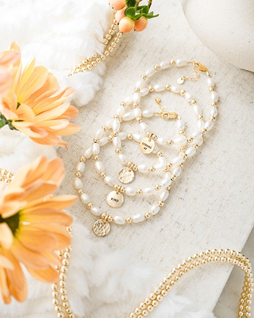 Each one is handcrafted with freshwater pearls, gold filled beads, and a hand-hammered charm engraved with your custom message on the back.