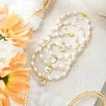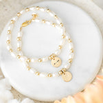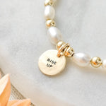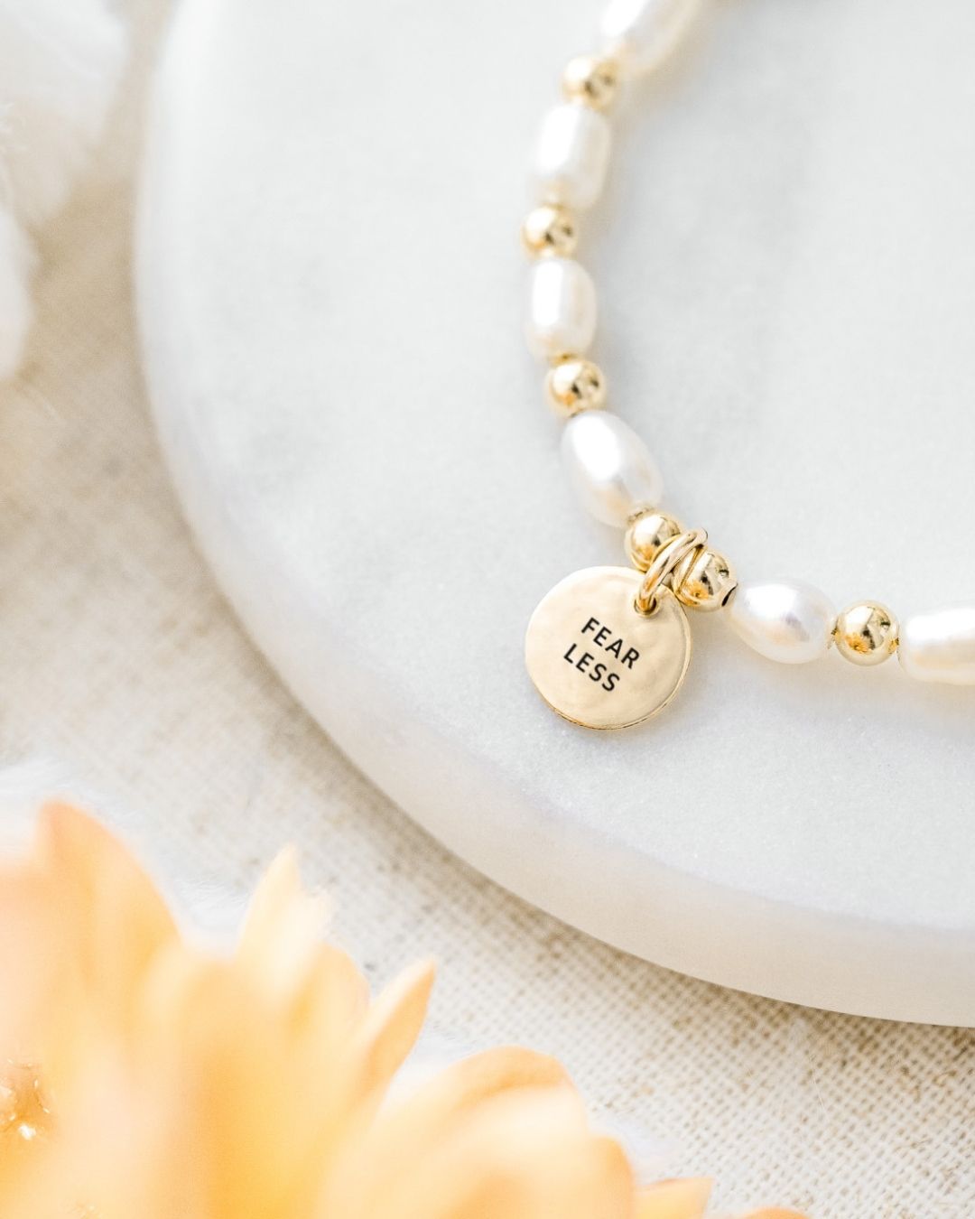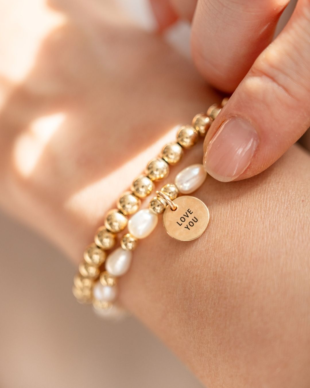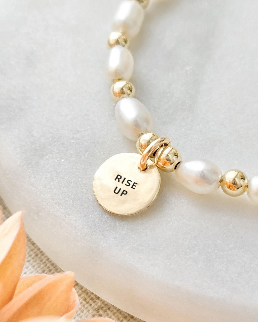 Each one is handcrafted with freshwater pearls, gold filled beads, and a hand-hammered charm engraved with your custom message on the back.