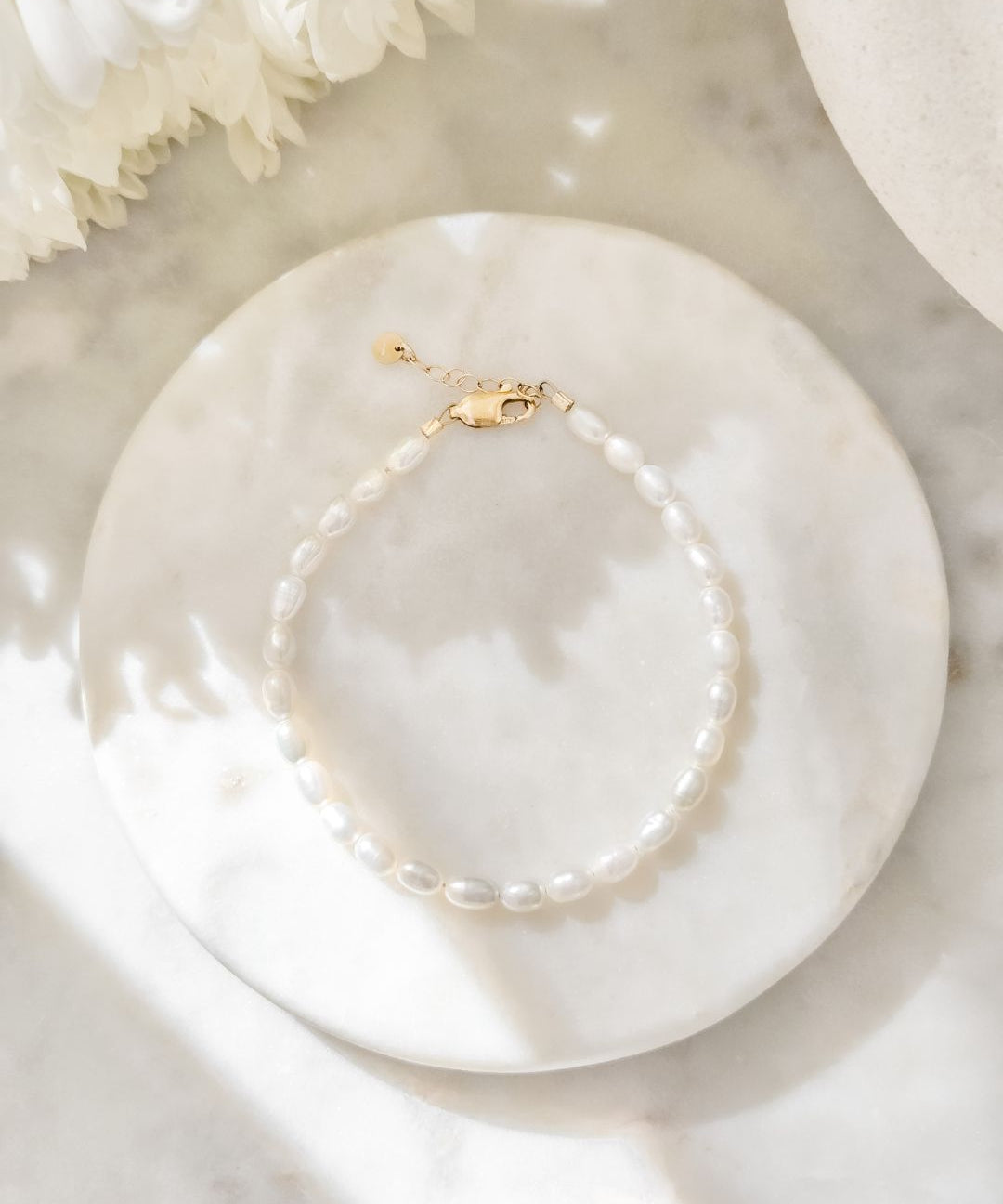 Luminous white freshwater pearls with a hint of gold. An ode to quiet strength and calm confidence.