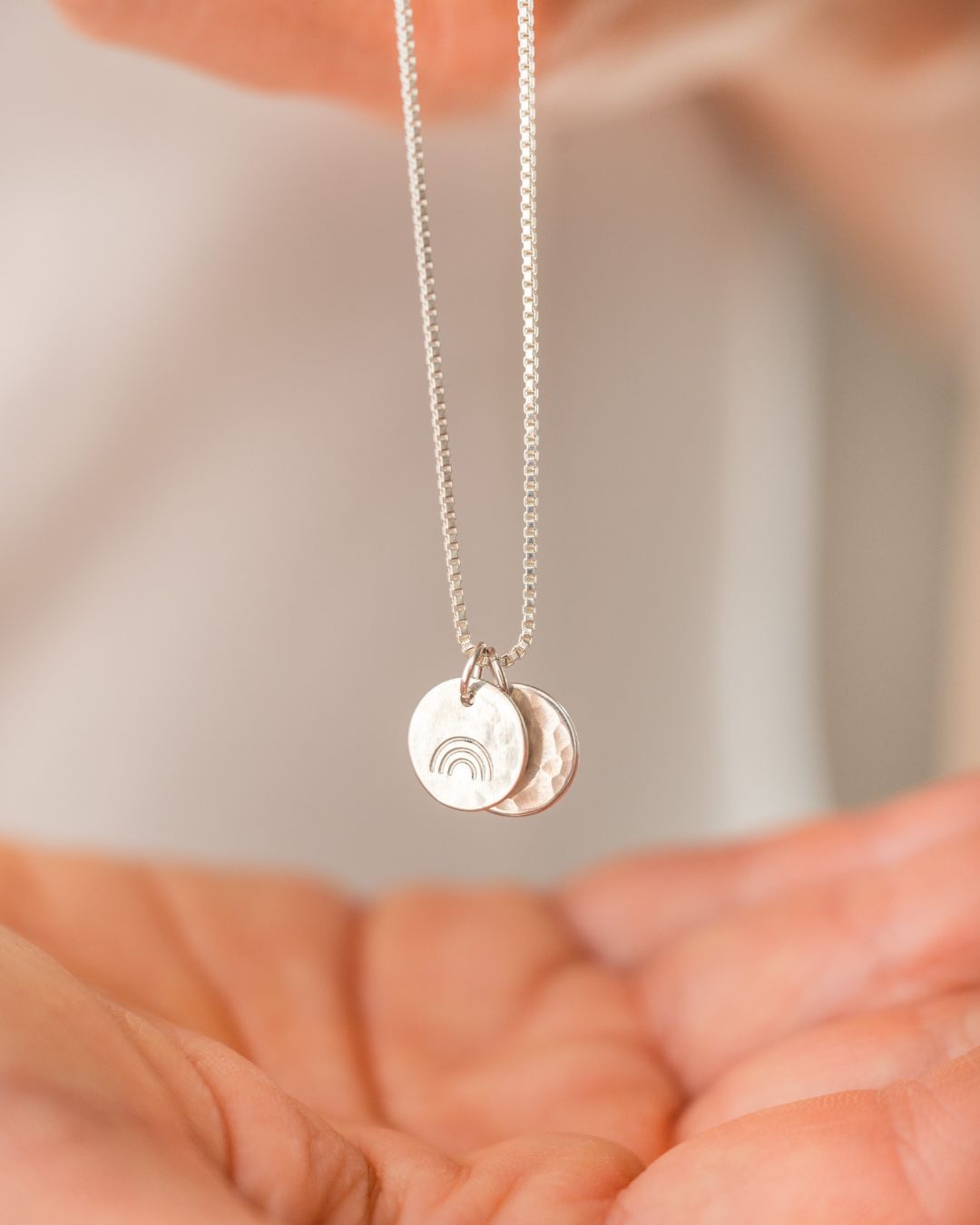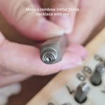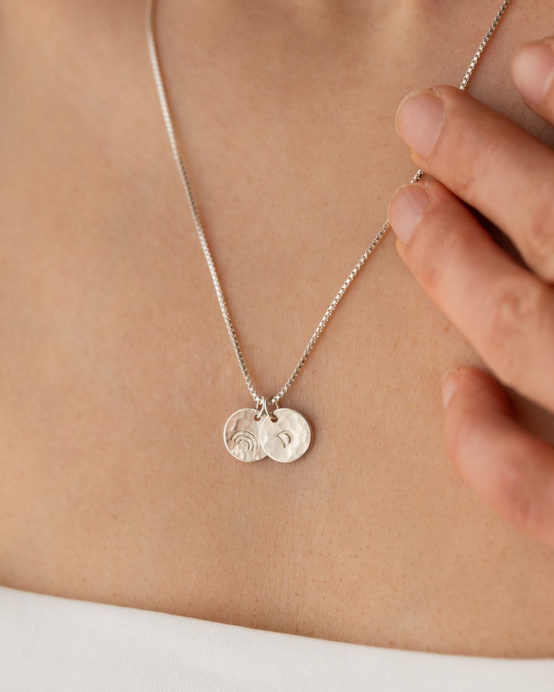 • Charm: 3/8" (9mm) disc, hand-hammered front with hand-stamped initial or symbol