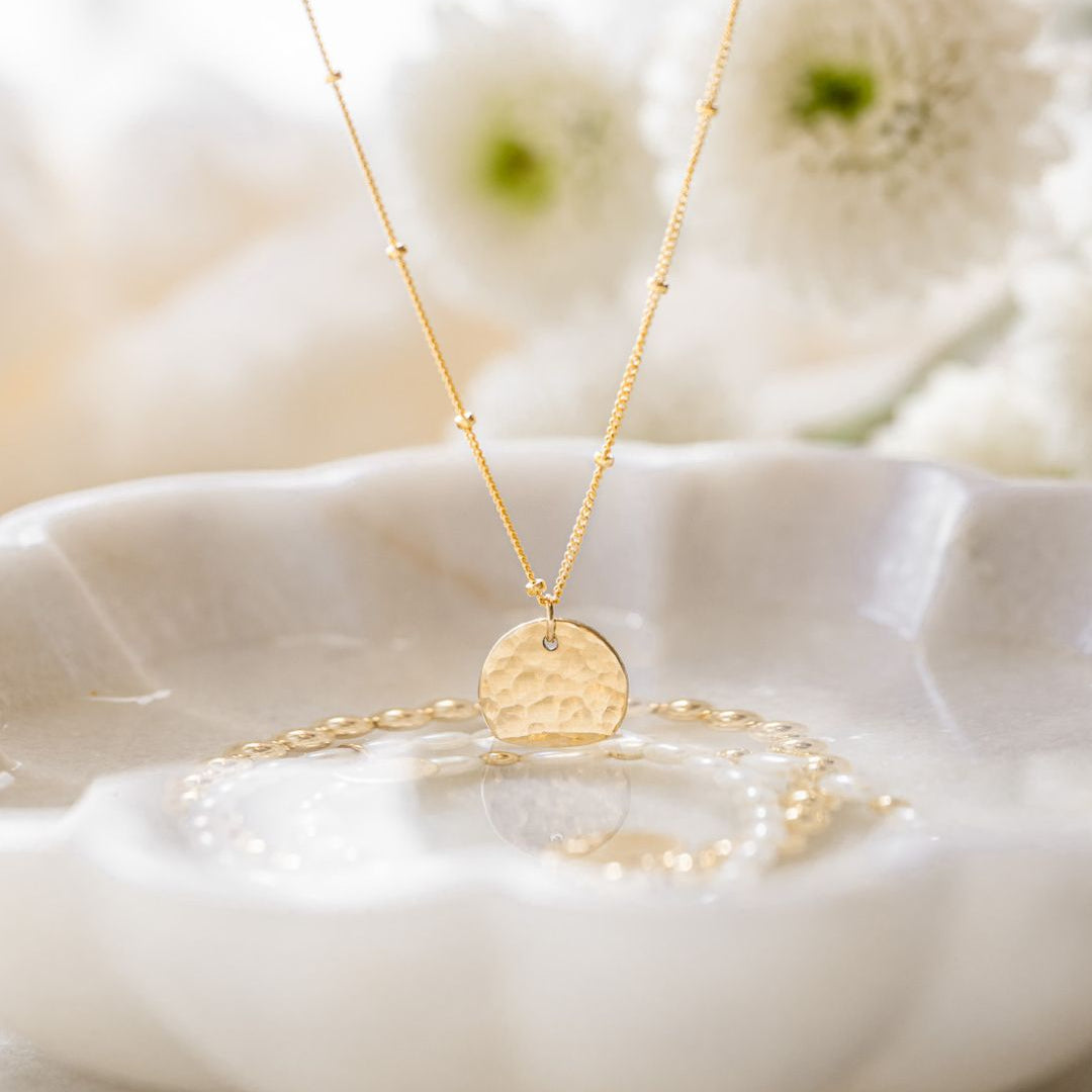 A hammered coin charm with a secret message on the back. An optional birthstone for a personal touch. Everyday simplicity, made meaningful