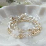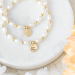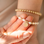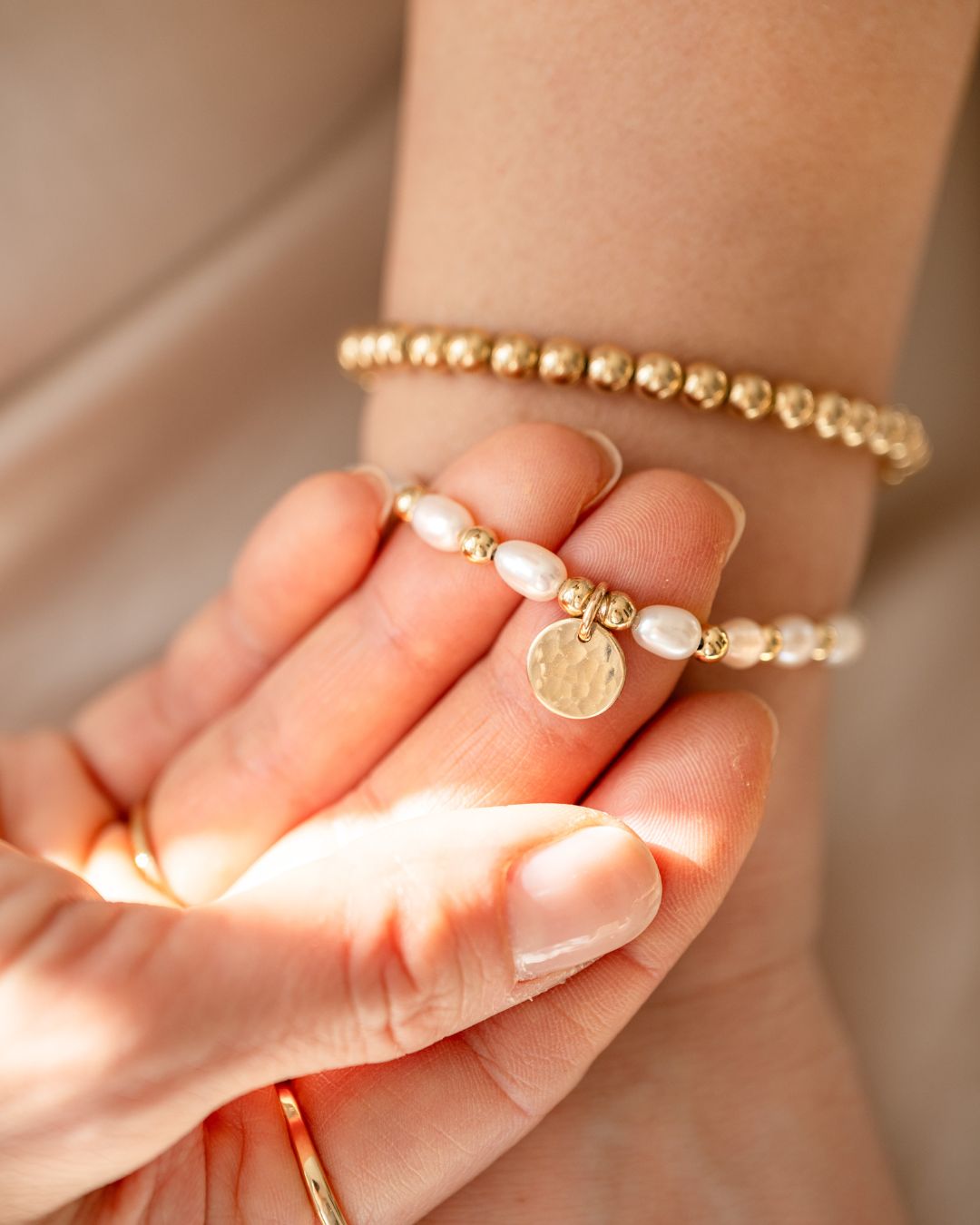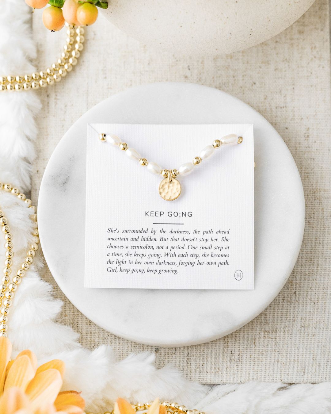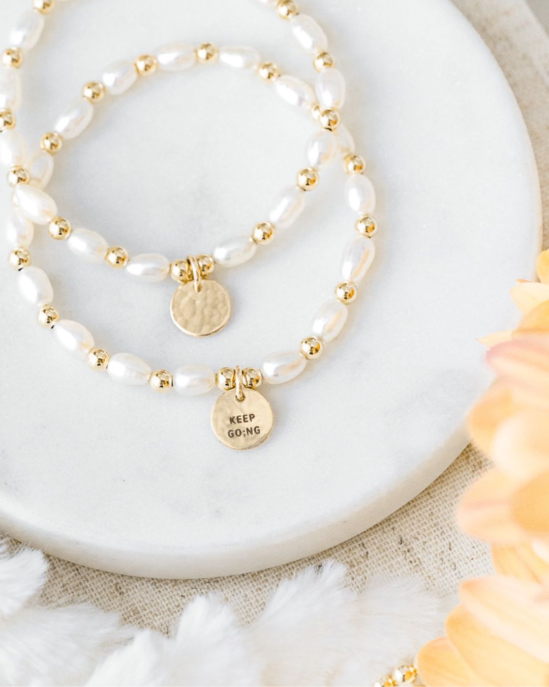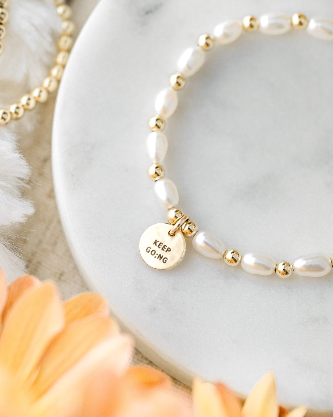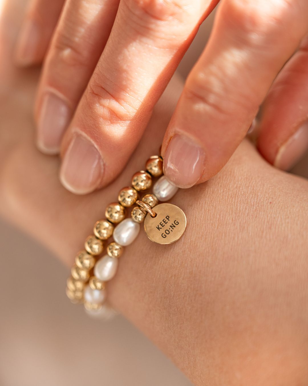 With lustrous freshwater pearls and gleaming gold filled beads, the Nora Bracelet strikes a graceful balance between softness and strength—just like you. The hand-hammered charm is engraved with “KEEP GO;NG” on the back, offering a secret dose of courage you can carry with you, always.