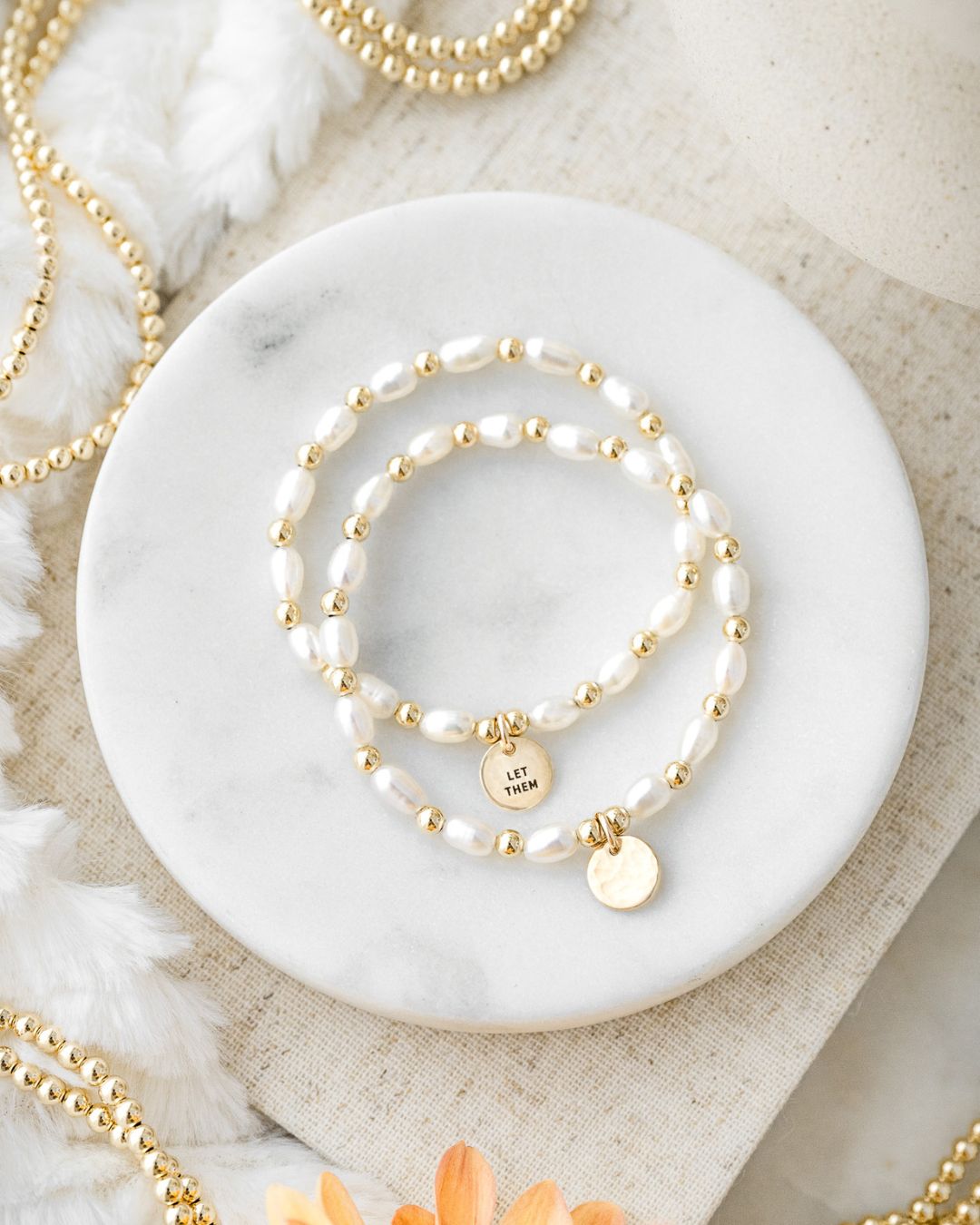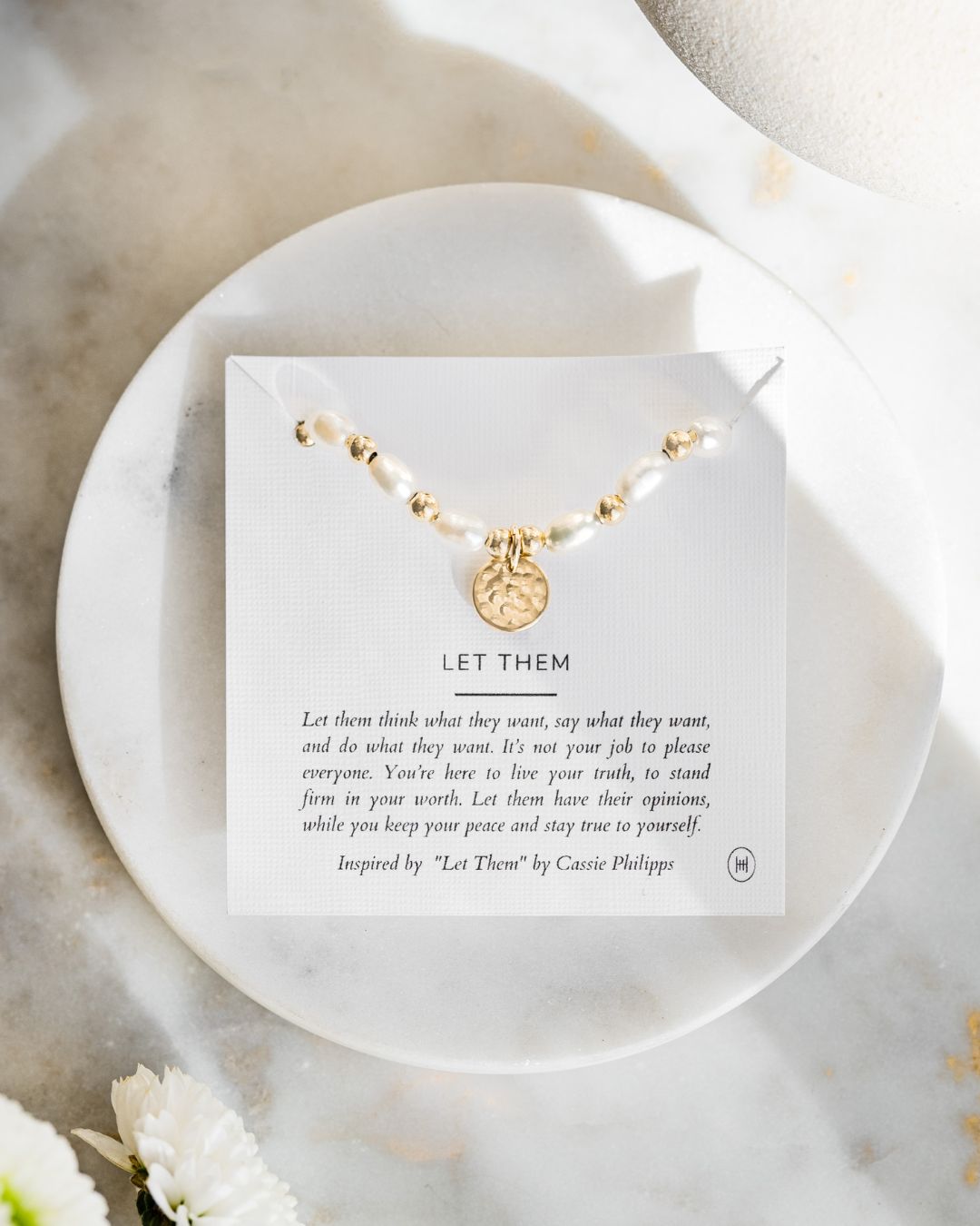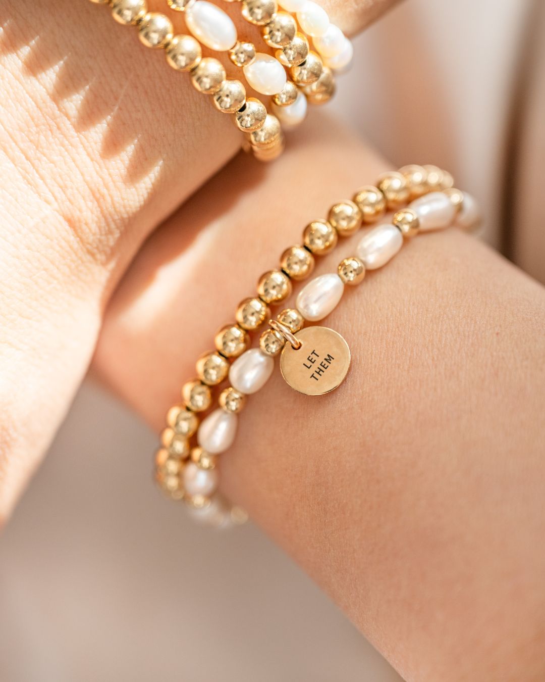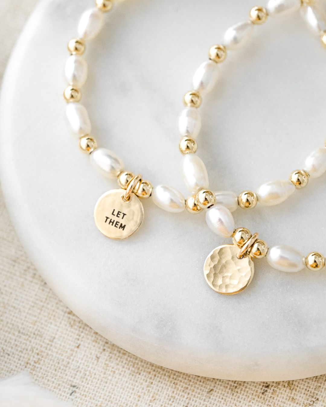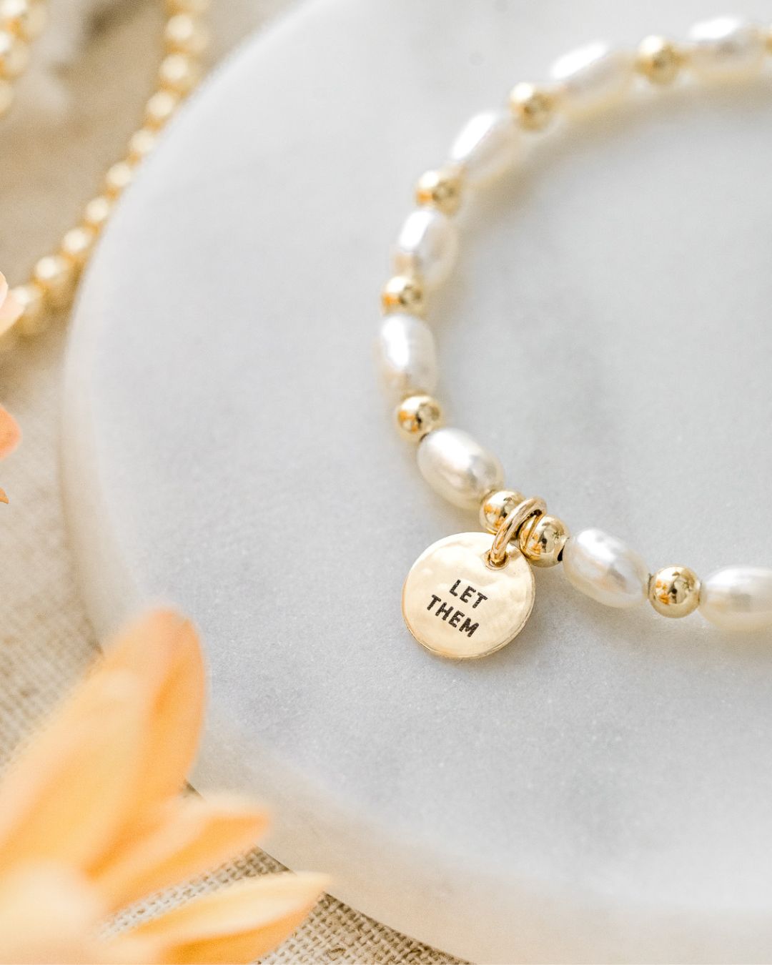 With luminous pearls and gold filled beads, the Nora Bracelet is a gentle reminder that peace begins where people-pleasing ends. Engraved with “LET THEM” on the back of its hand-hammered charm, it’s your invitation to stop chasing approval, release what you can’t control, and turn inward. Let them think what they will—you're choosing yourself now. 💛