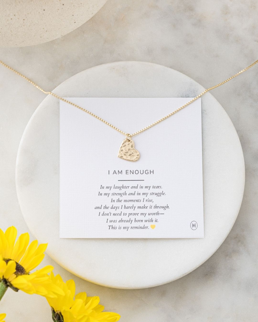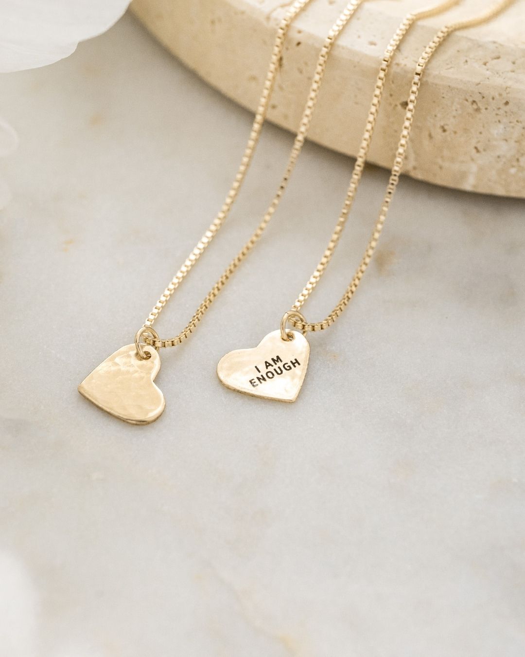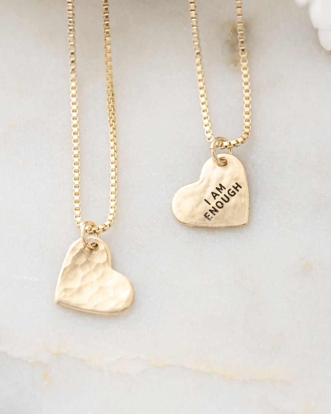 This hammered heart charm holds a secret engraving on the back: I AM ENOUGH.