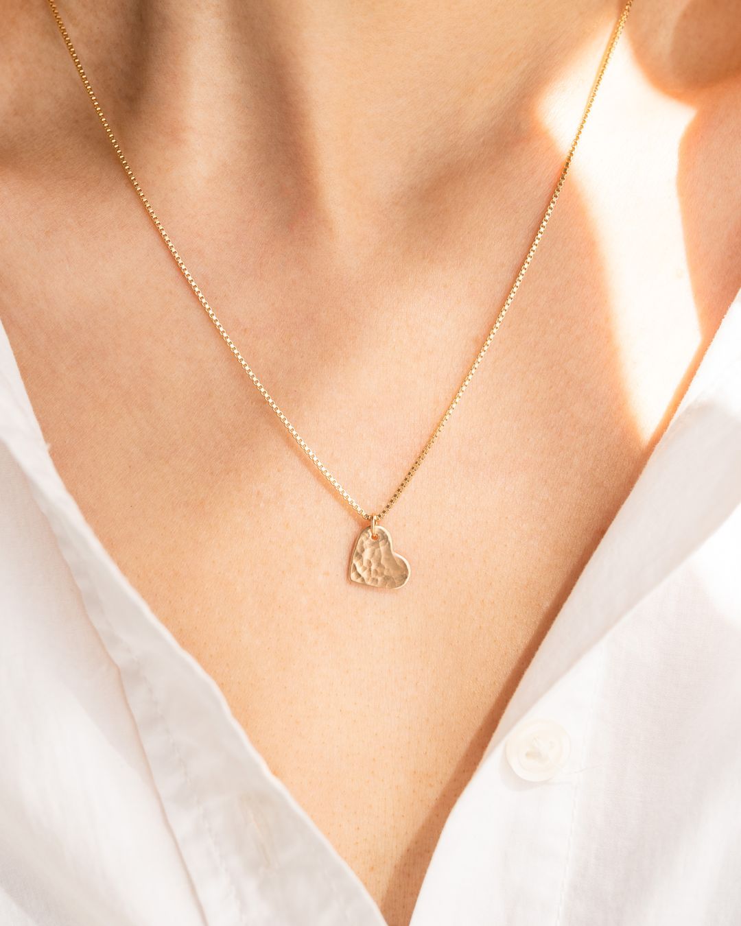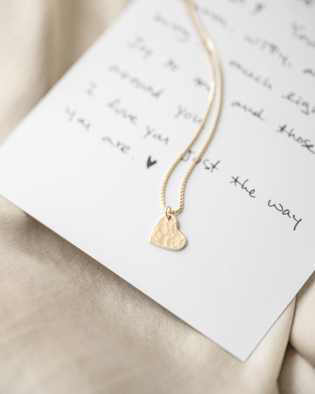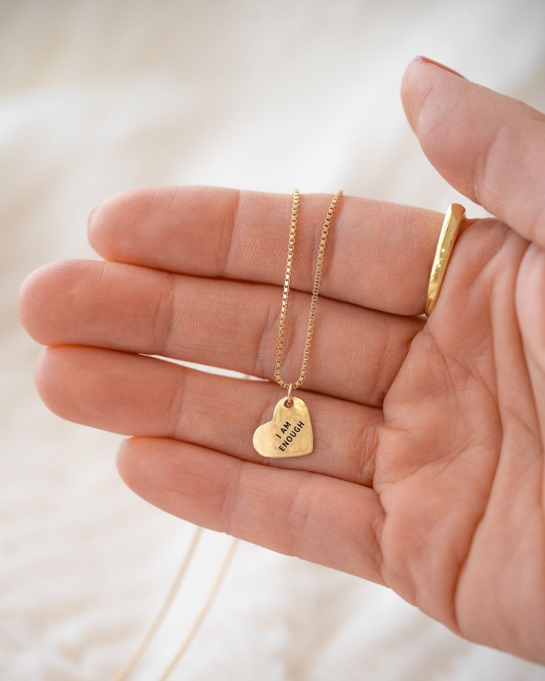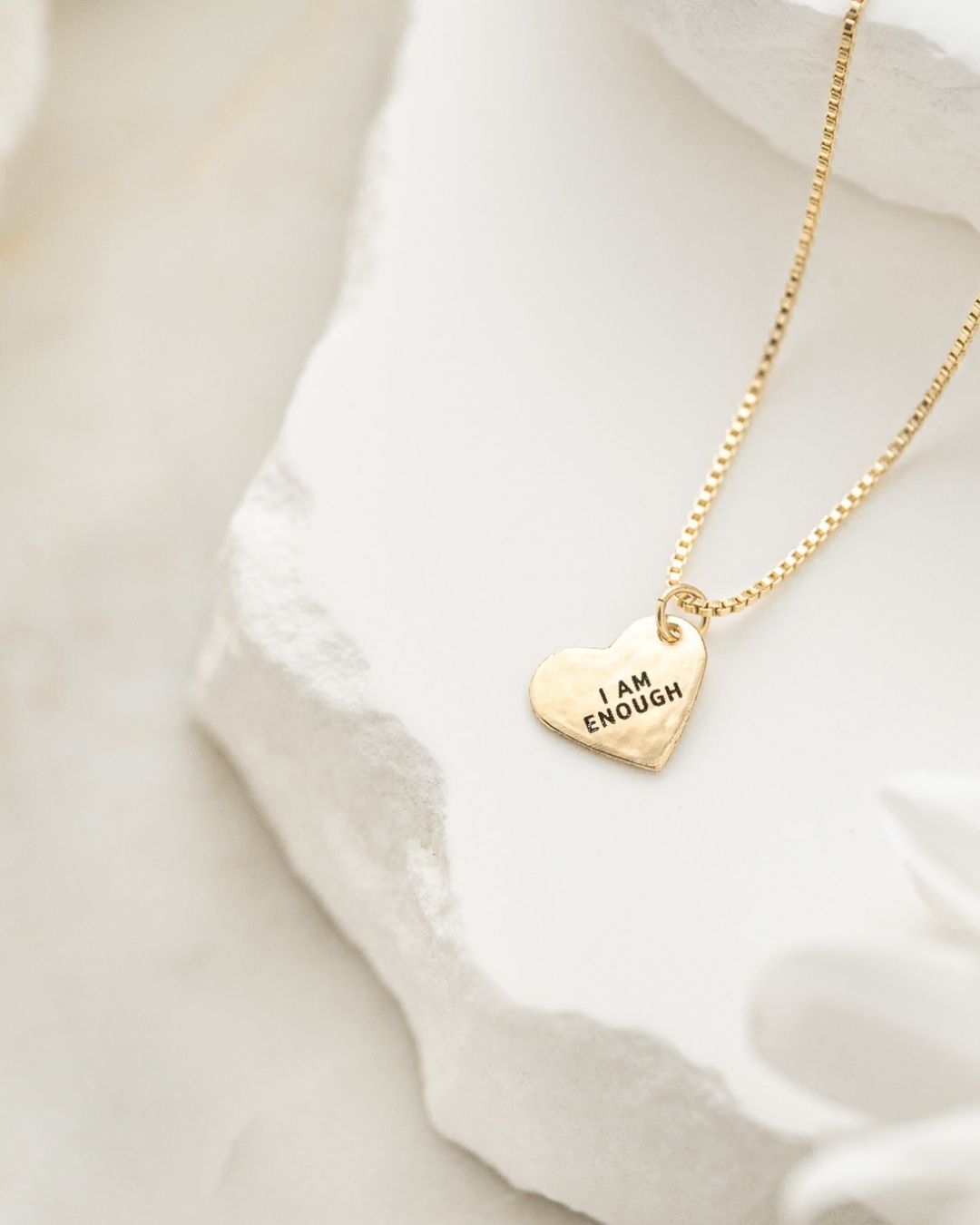 This hammered heart charm holds a secret engraving on the back: I AM ENOUGH.