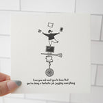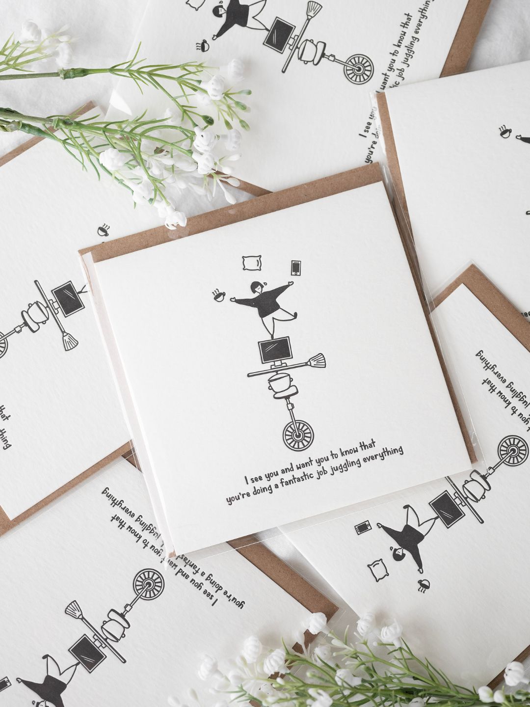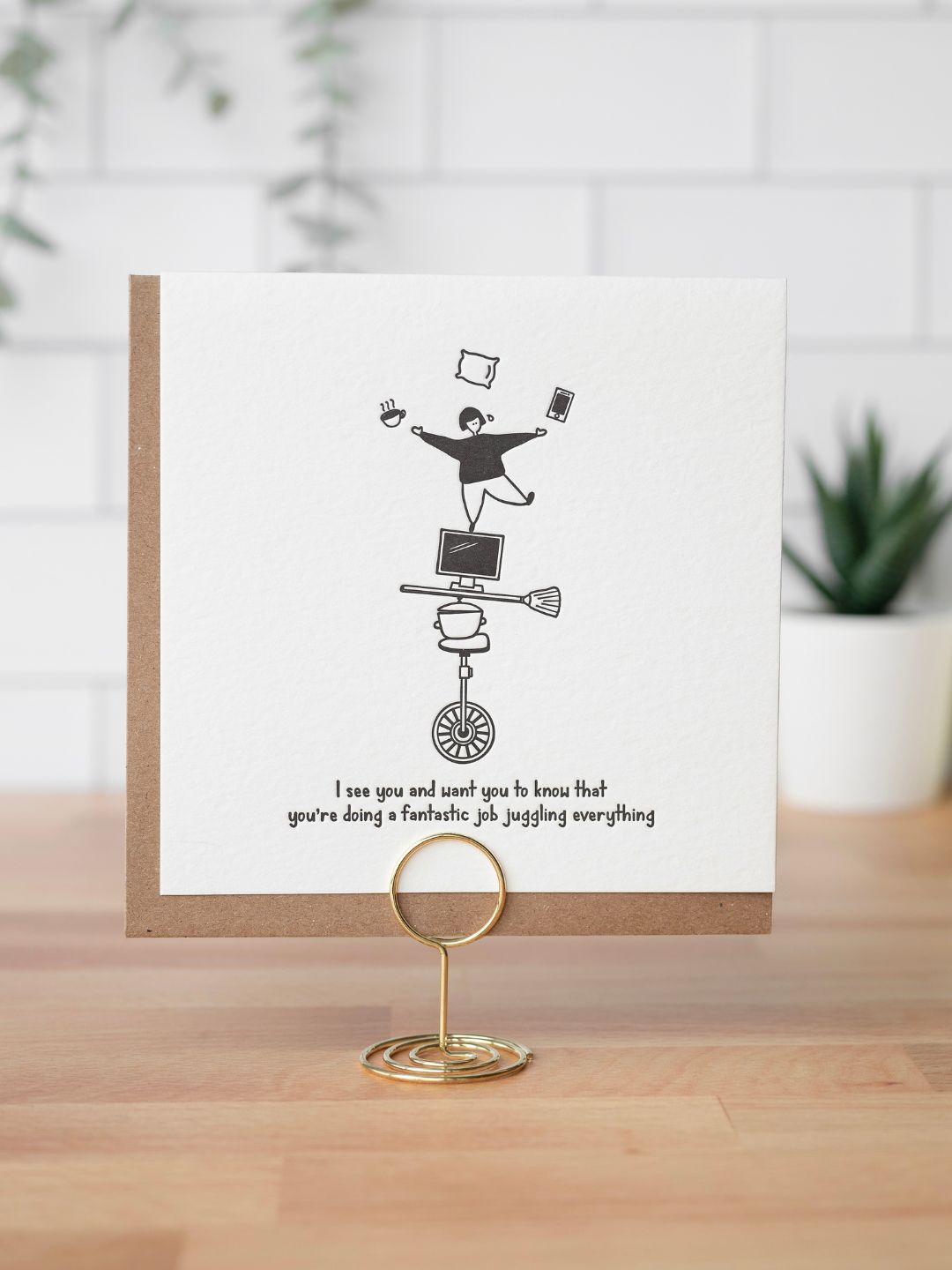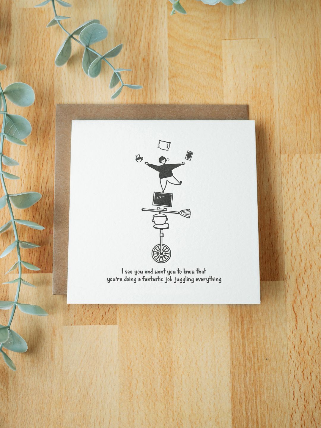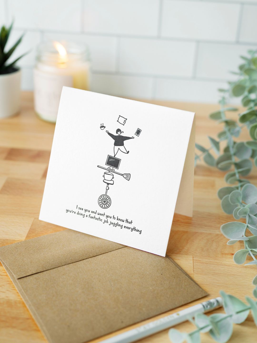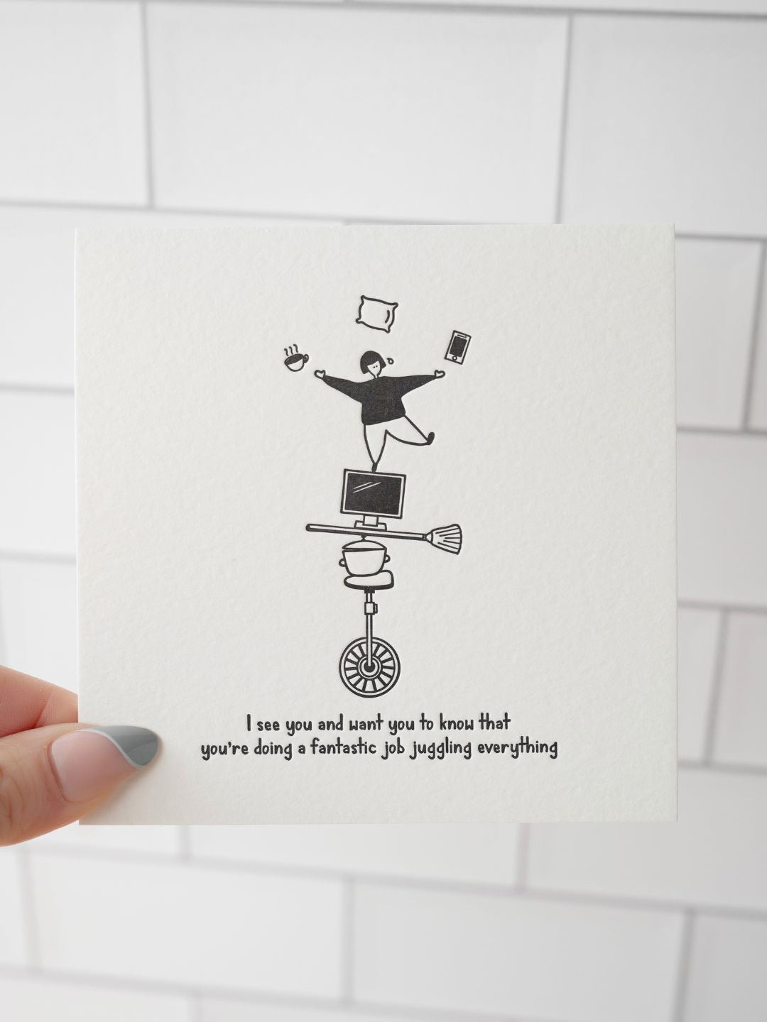 A thoughtful reminder to keep going for those doing their best to juggle all their responsibilities. A great pick-me-up card for parents, caretakers, entrepreneurs, students, and anyone doing the most to live life to its fullest!