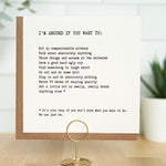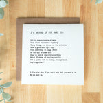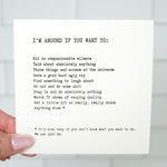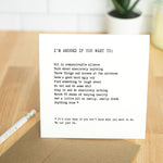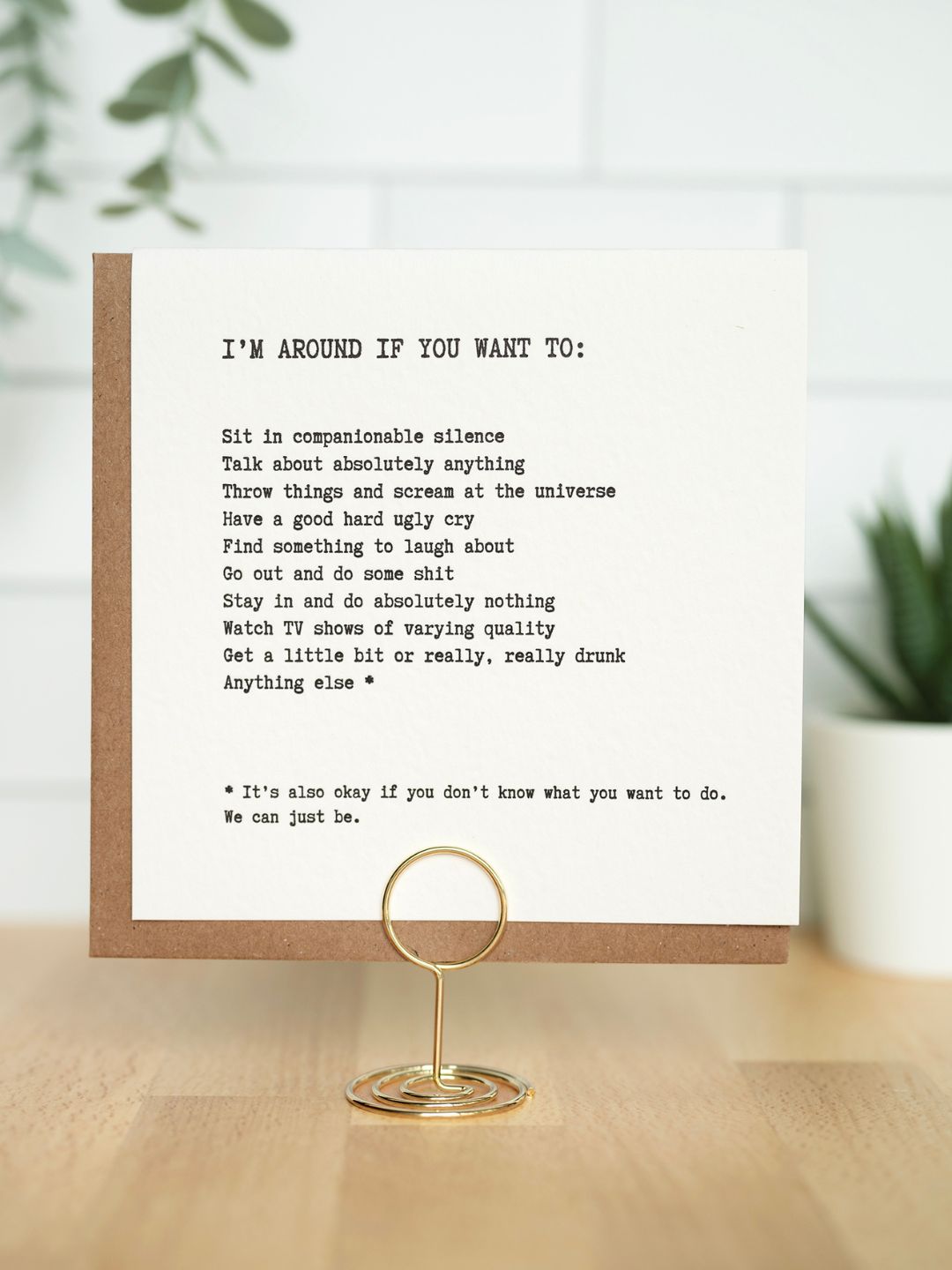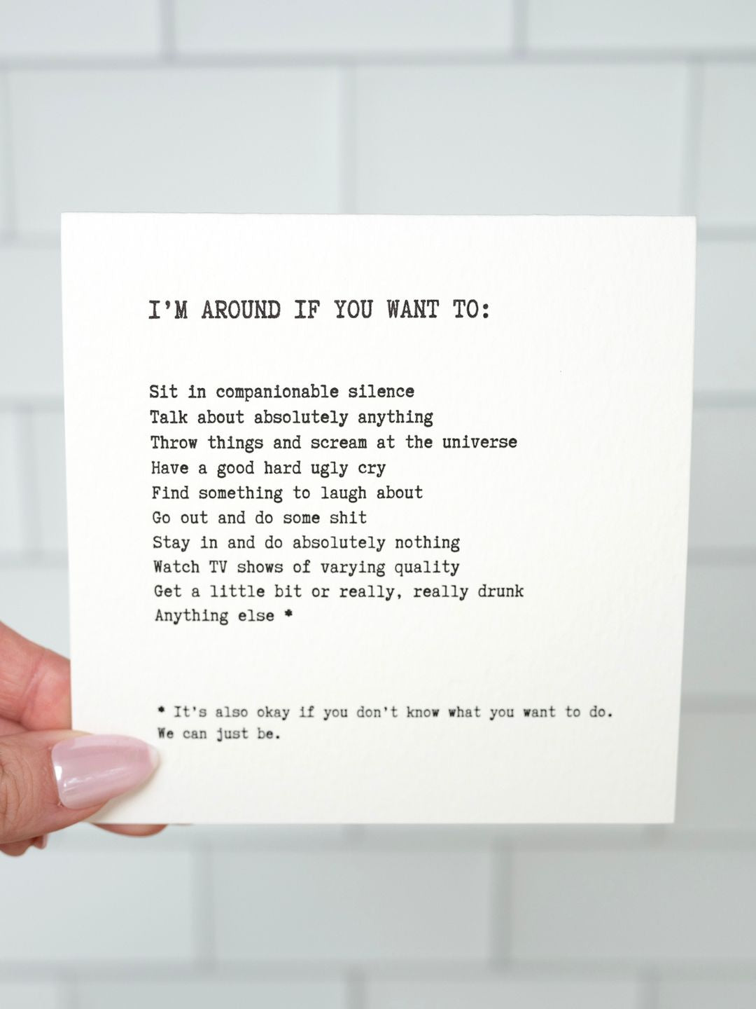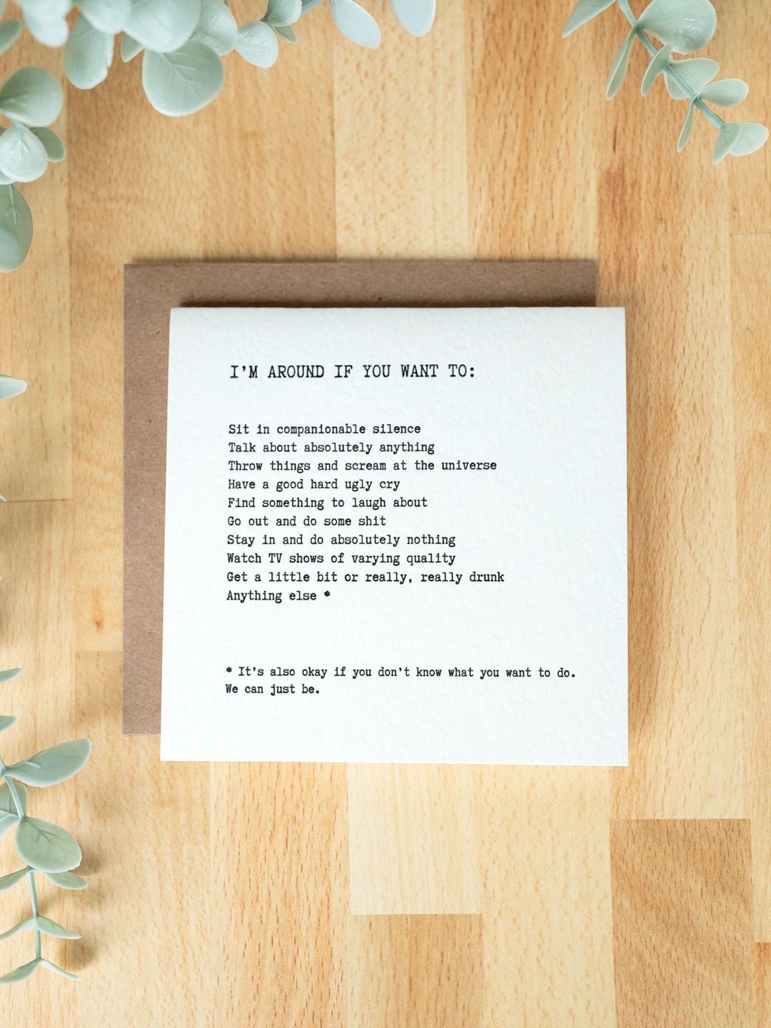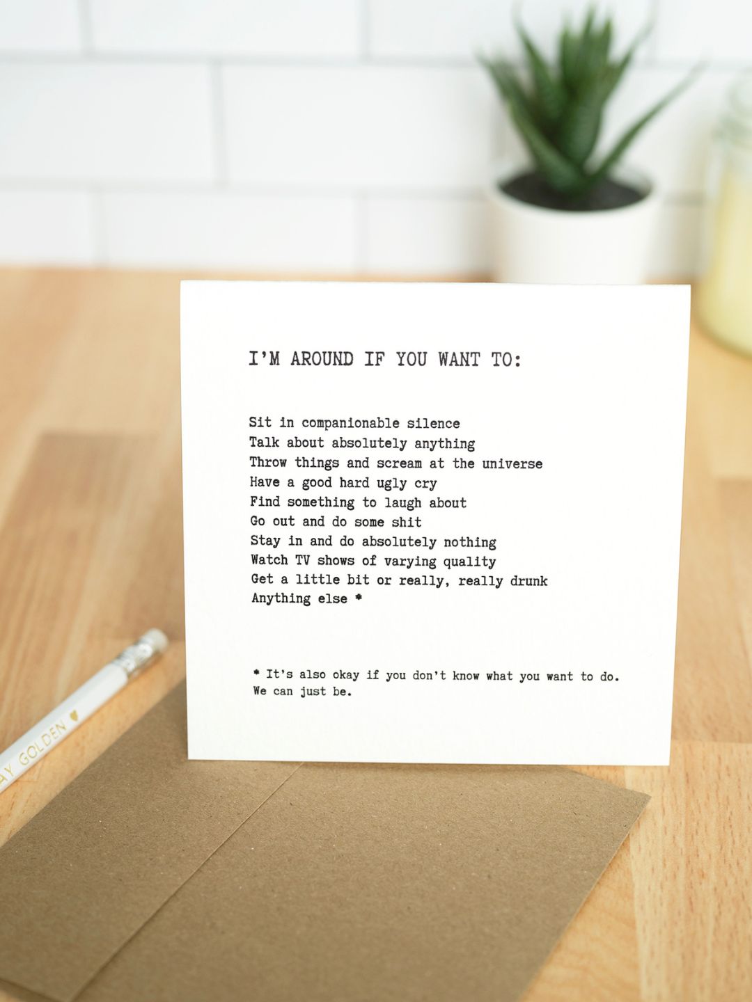 Sometimes, the best support is just being there, however 'there' looks at the moment. Our 'I'm Around If You Want To' Empathy Card captures this sentiment perfectly. From sitting in silence to letting out a good scream, this card lays out a smorgasbord of options for companionship. It takes the pressure off, giving both you and your loved one the freedom to just 'be,' without any expectations or judgments. This card says, 'I'm here, in whatever way you need,' making it easier for your loved one to lean on you in their own way.