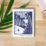 Featuring a beautifully hand-carved linocut design of a cozy cabin nestled inside a forest, this "Prioritize Your Peace" empathy card is perfect for encouraging someone to prioritize their mental health. Remind your loved one to slow down, love themselves more, and take the necessary time to rest.