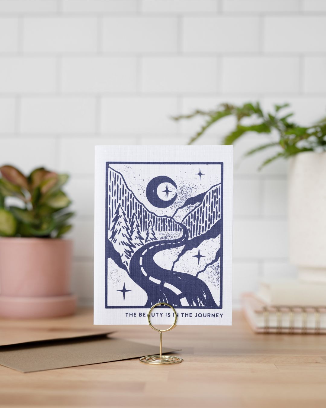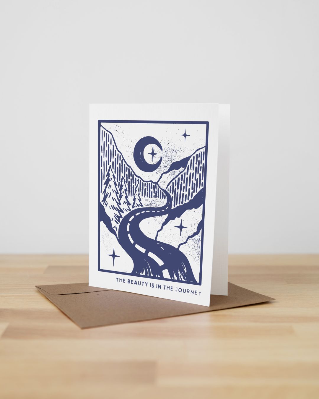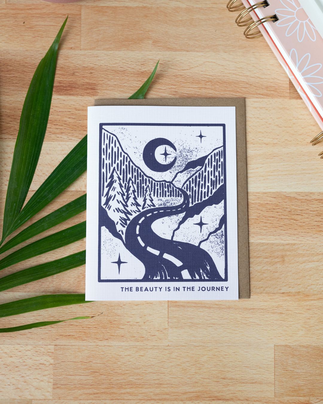 Featuring a hand-carved linocut design of a path through a forest with stars hidden along the way, this "The Beauty is in the Journey" empathy card is a perfect gift for someone who needs encouragement. Whether they've faced setbacks, feel burned out, or are embarking on a new chapter, this card serves as a heartfelt reminder to slow down and enjoy the process.