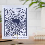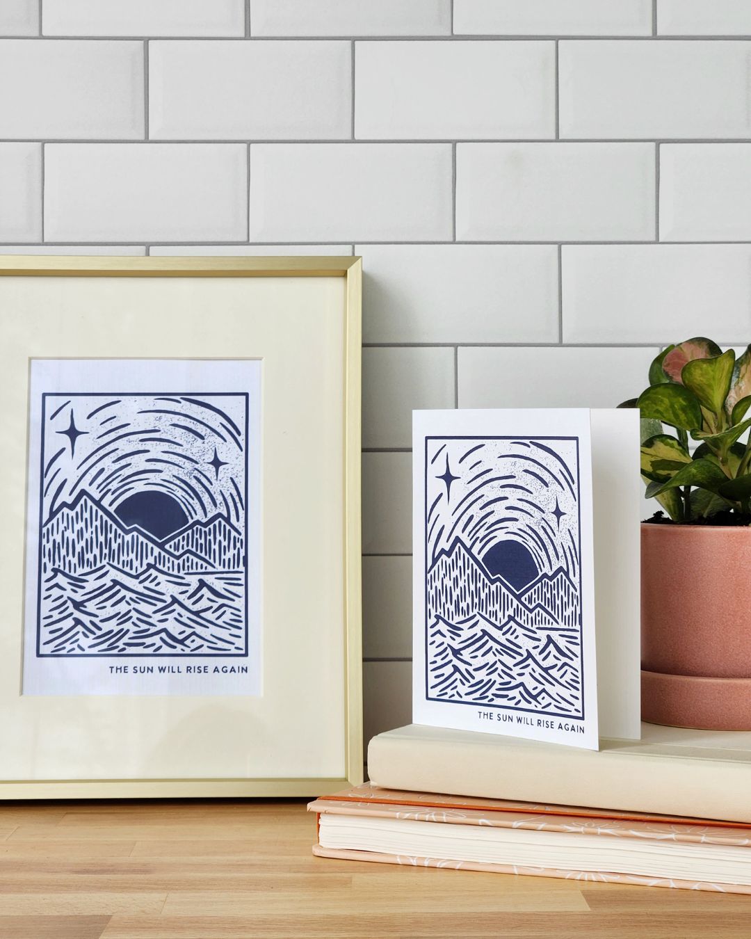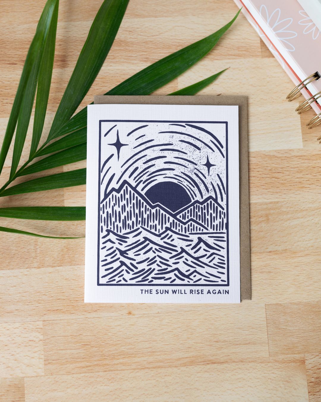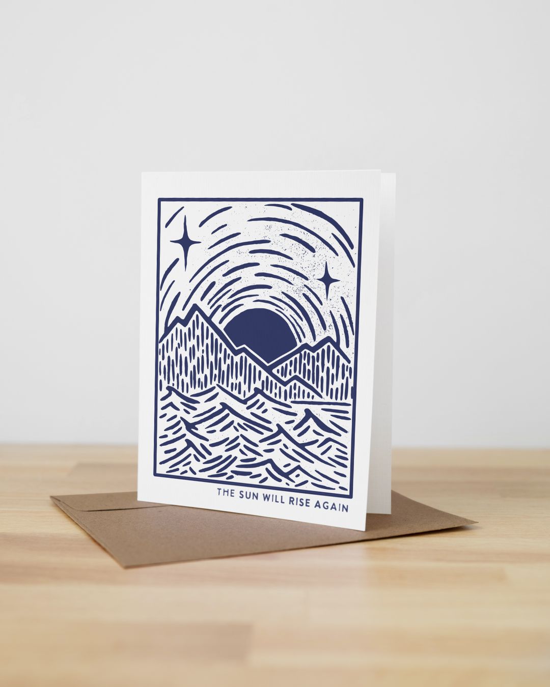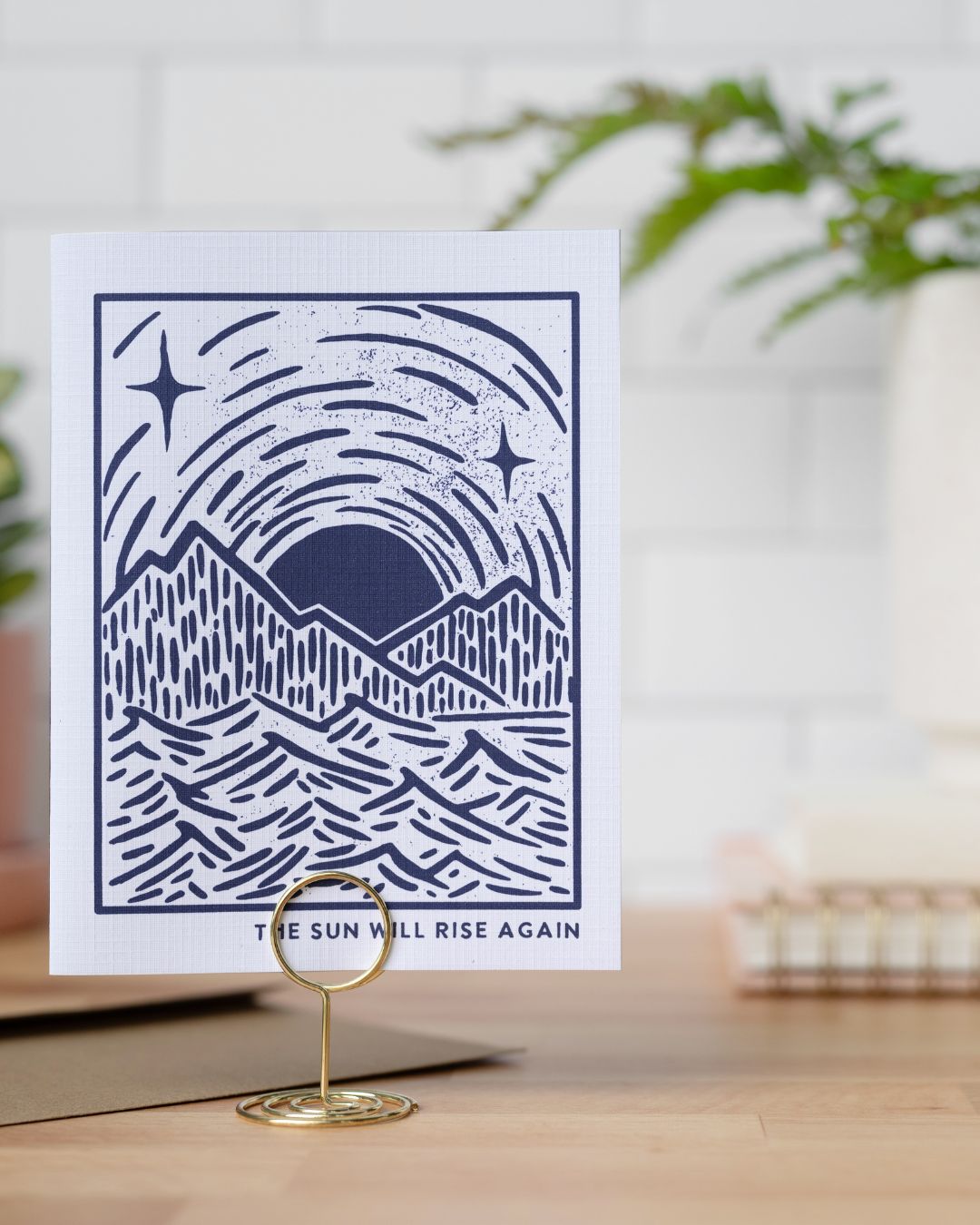 Featuring a beautifully hand-carved linocut design of a sunrise, this empathy card is a perfect addition to a thoughtful gift for those going through a difficult time. The linen textured card stock and dark navy ink create an elevated, nostalgic, and handcrafted look, perfect for conveying your thoughtful message.