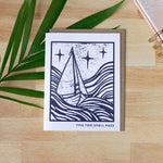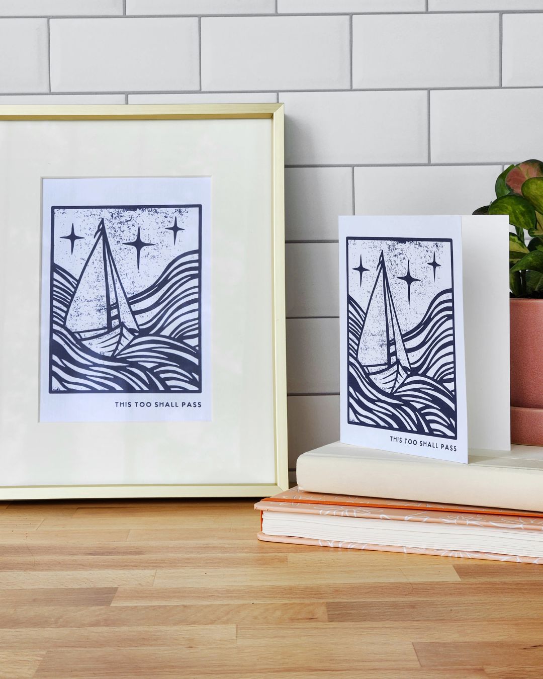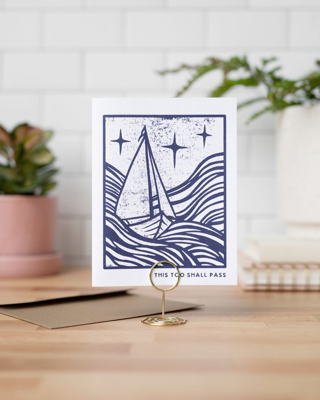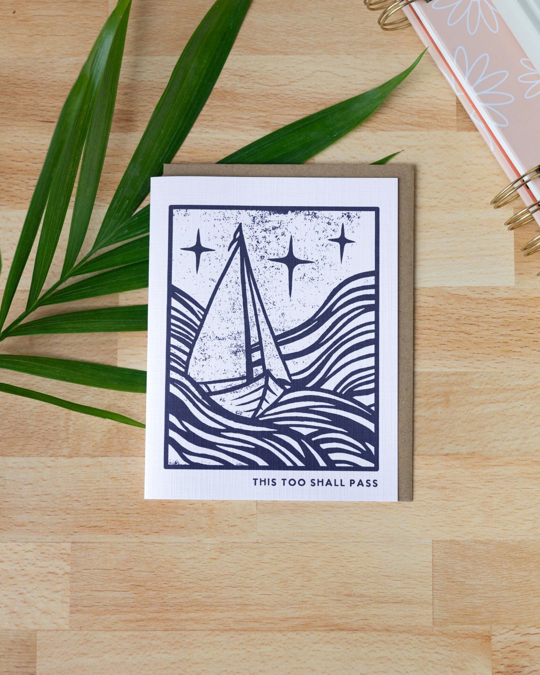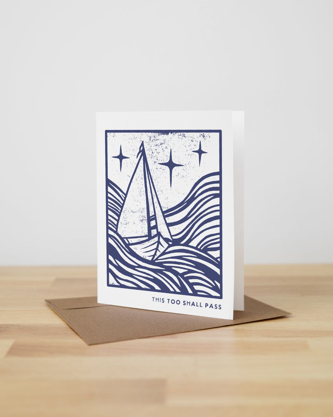 Featuring a hand-carved linocut design of a sailboat navigating a stormy night ocean, this "This Too Shall Pass" empathy card is the perfect way to send an encouraging message to someone going through a difficult time. It's an ideal gift for those struggling with anxiety, depression, or other mental health issues, or facing any setbacks.