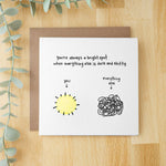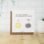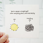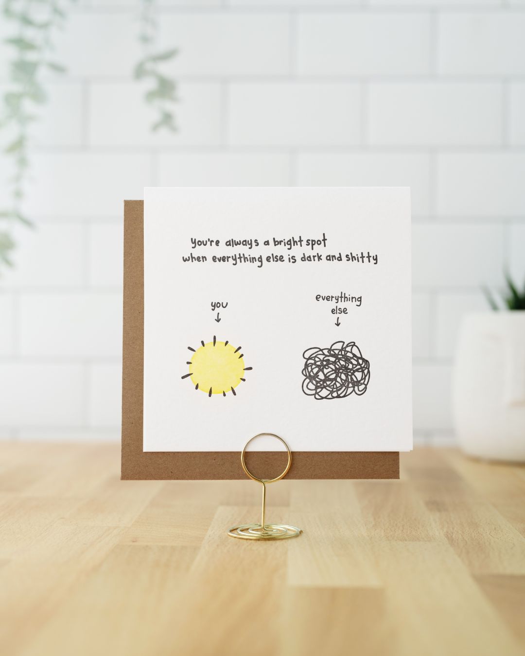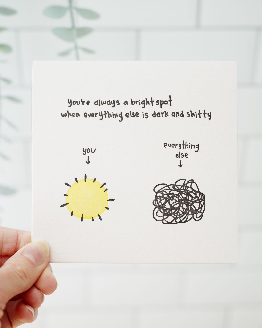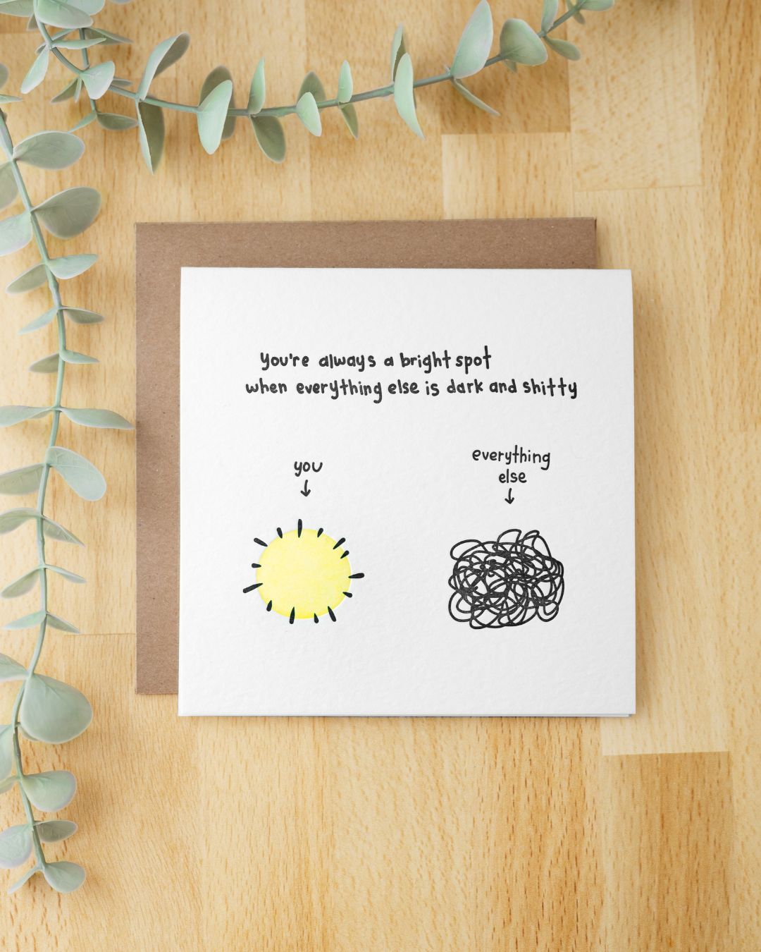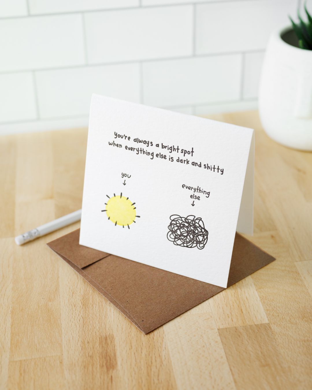 Do you have someone who makes your life brighter when everything else feels dark and shitty? Let them know how much they mean to you with this card—it’s the perfect way to remind them they’re your bright spot!