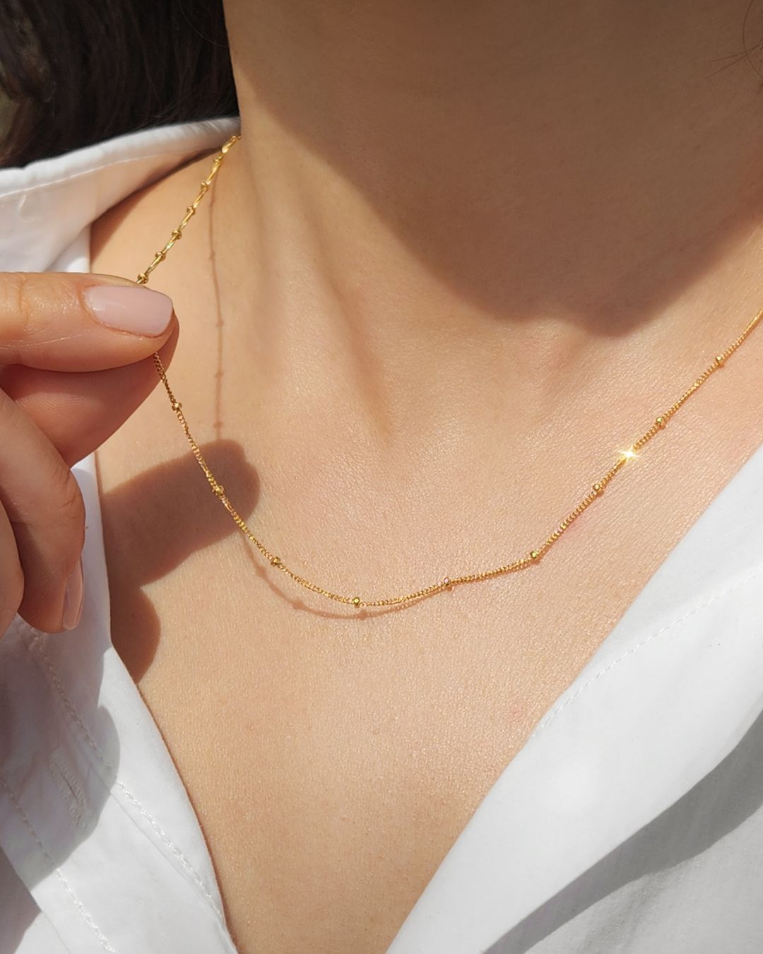 Store your jewelry in a cool, dry place, ideally in a soft pouch or jewelry box to prevent scratches and tangling. Keeping pieces separate will help maintain their shine.