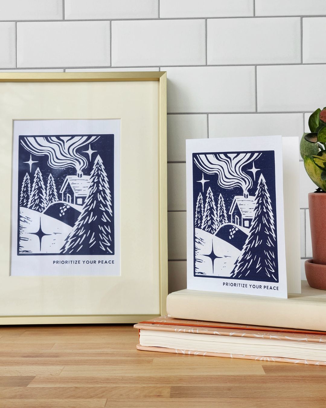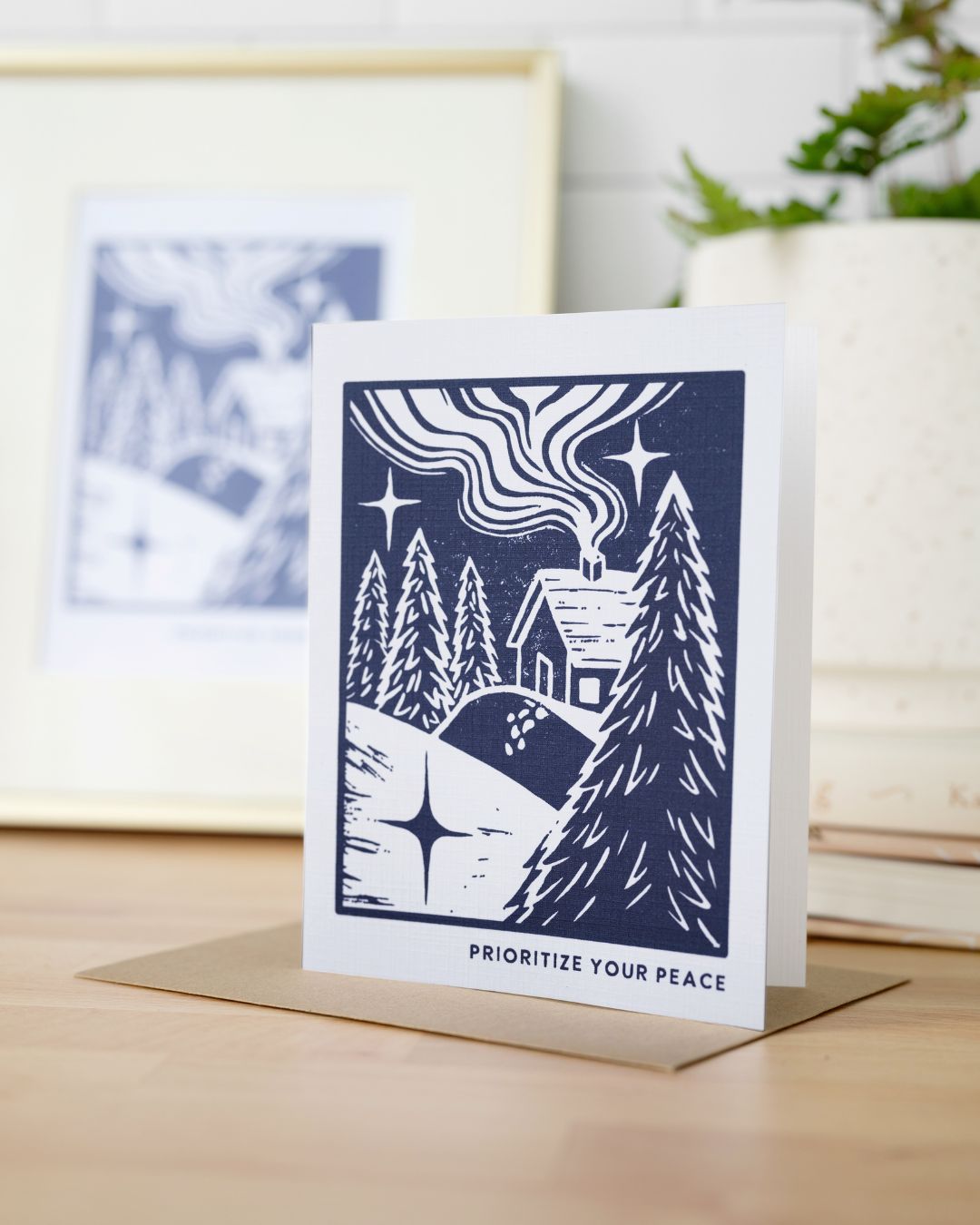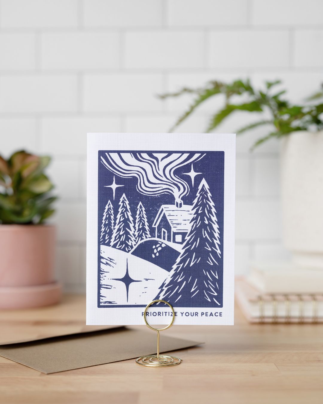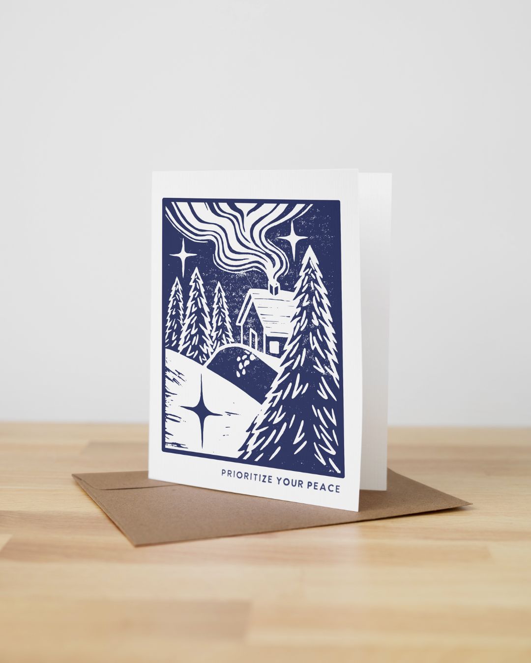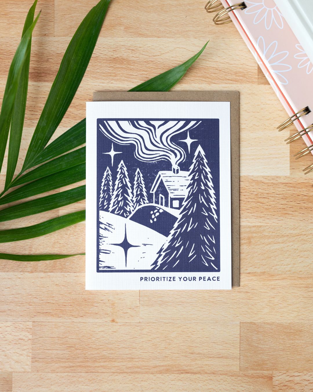 Featuring a beautifully hand-carved linocut design of a cozy cabin nestled inside a forest, this "Prioritize Your Peace" empathy card is perfect for encouraging someone to prioritize their mental health. Remind your loved one to slow down, love themselves more, and take the necessary time to rest.